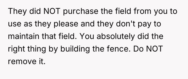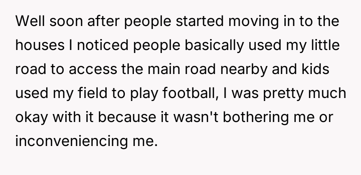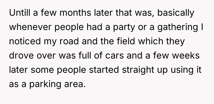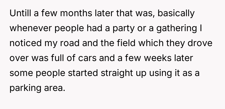The original poster (OP) initially tolerated the neighbors' use of their private road and field as a shortcut and parking area out of a desire to maintain peace. However, after repeated violations escalated to aggressive confrontations and constant inconvenience, the OP took decisive action by building a fence, leading to a significant conflict with neighbors who valued the convenience the OP's property provided.