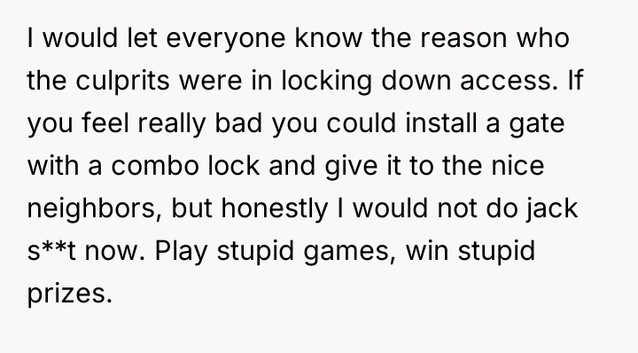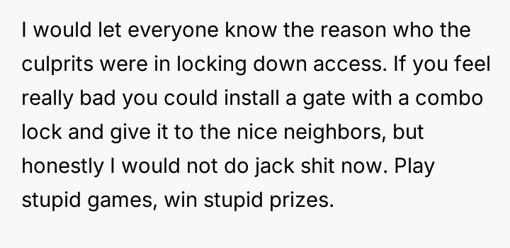 The central question is whether the OP was justified in prioritizing their property rights and peace by building a restrictive fence, even though this action now negatively impacts even the neighbors who were previously respectful. Should the OP maintain the fence due to past disrespect, or should they remove it to restore convenience for the community, including the polite neighbors?