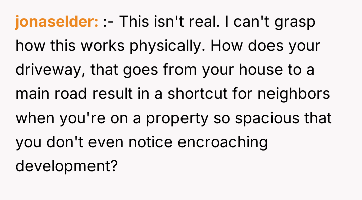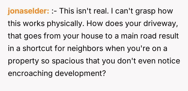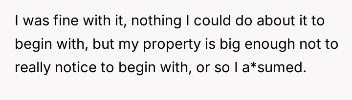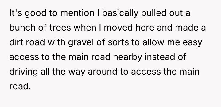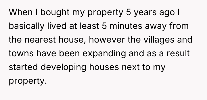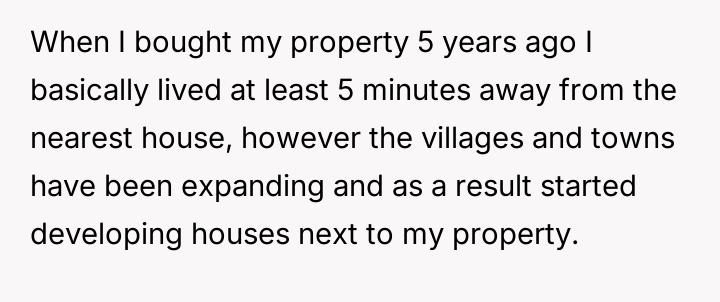 In a quiet corner of expanding civilization, a man cherished his vast, secluded property—a sanctuary five minutes away from the nearest neighbor when he first arrived. Over five years, the relentless march of progress crept closer, planting houses at his borders and weaving strangers into the fabric of his once solitary domain.