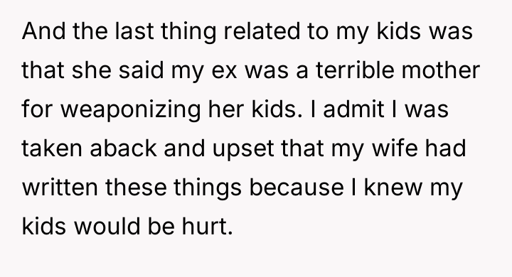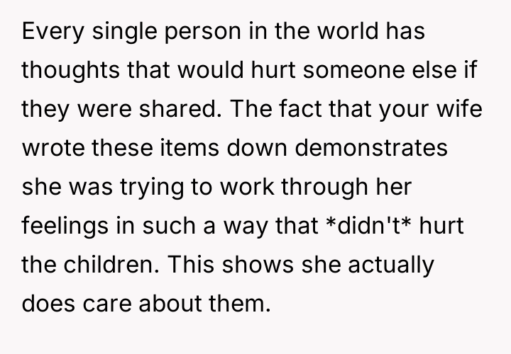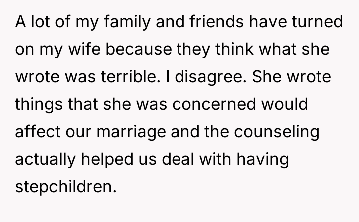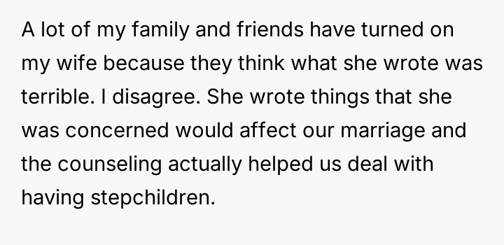 Was the OP correct to stand by his wife's right to privacy regarding her therapeutic writings, despite the resulting damage to his relationship with his children, or did his support overlook the intense hurt caused by his wife's private criticisms? How can this blended family move forward when core trust has been shattered by the revelation and subsequent public exposure of private thoughts?