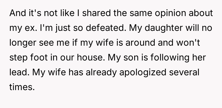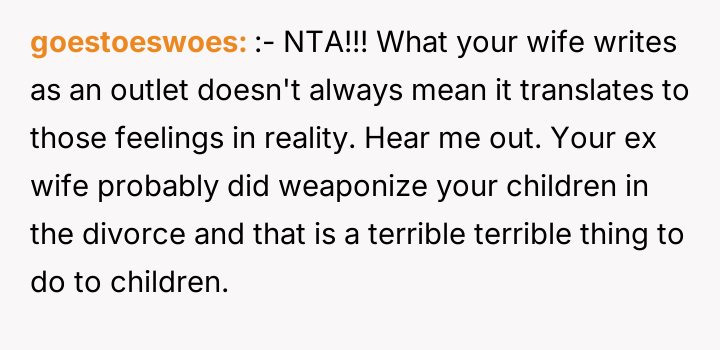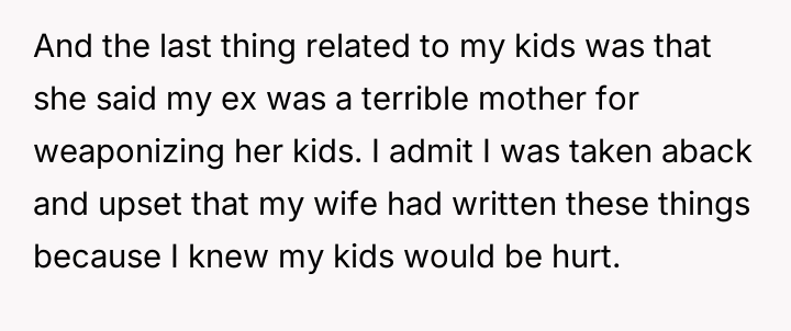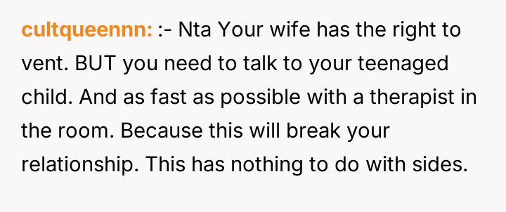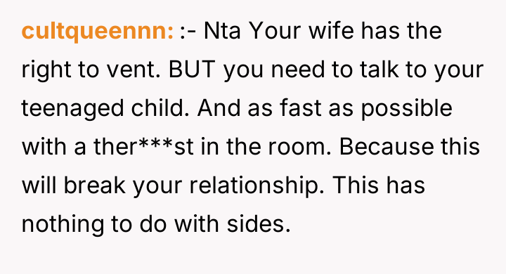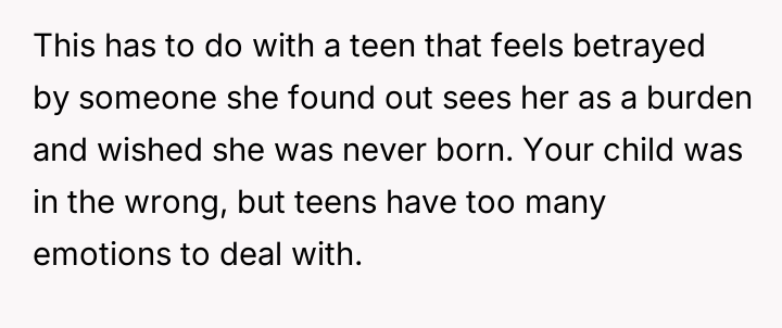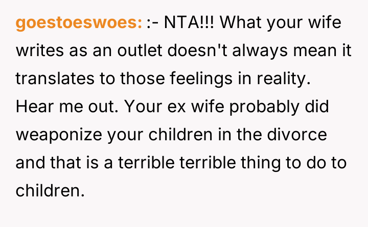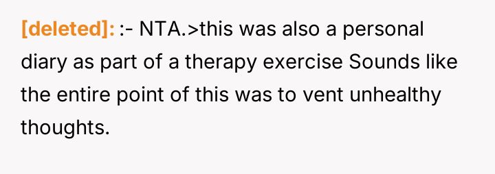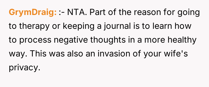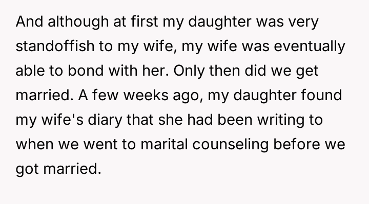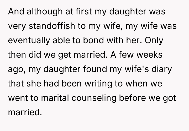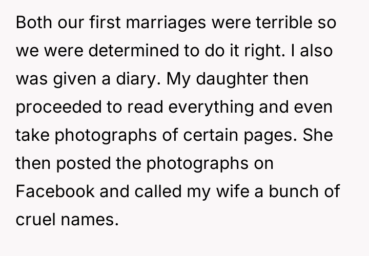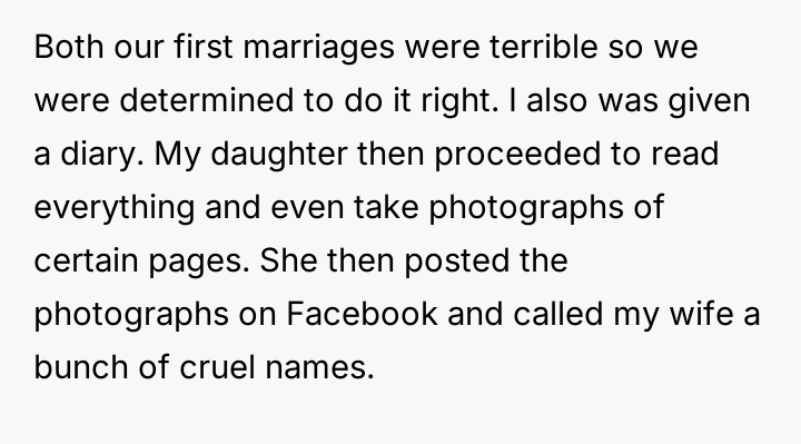 As renowned family therapist Dr. Harriet Lerner explains, “When we are hurt, our first impulse is often to hurt back, especially when we feel powerless.” This situation is a complex intersection of privacy boundaries, adolescent distress, and the inherent difficulties in merging families post-divorce. The daughter’s actions—reading a hidden diary, photographing sensitive content, and posting it publicly—are extreme reactions rooted in feeling betrayed or perhaps threatened by the new marital dynamic, even if the wife's diary entries were part of a therapy exercise meant to process difficult emotions. The wife’s writings, though private and likely therapeutic in nature, touched upon highly sensitive areas: the OP’s ex-partner, and perceived negative traits in the children. While the OP is correct that the diary represented a private space for processing, the content directly implicated others, making the daughter's reaction, though disproportionate, understandable from a place of intense emotional pain and perceived disloyalty. The OP’s position of unconditionally supporting his wife is understandable given the context of the shared therapeutic journey; however, it has created an untenable situation with his children. The immediate need is de-escalation. A constructive next step would involve the OP creating space for his children to express their anger without immediate defense of the wife, while separately establishing firm boundaries against public defamation. Future conflict resolution must prioritize mediated communication focused on rebuilding trust, perhaps involving a therapist specialized in stepfamily dynamics, rather than taking sides outright.
