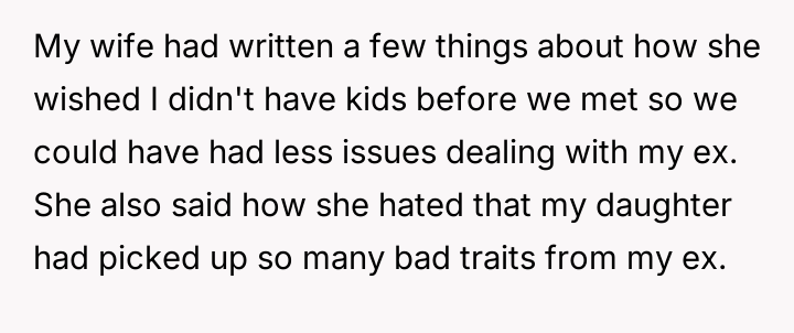 The original poster (OP) is facing immense family conflict after his daughter exposed his wife's private diary entries, which contained critical but vulnerable reflections on the blended family dynamics and the OP's ex-spouse. The OP has chosen to support his wife, leading to alienation from his daughter, son, and extended family, while simultaneously facing legal threats from his ex-wife regarding custody.