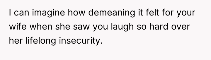 As renowned researcher Dr. Brené Brown explains, “Boundaries are the distance at which I can love you and me simultaneously.” In this scenario, the OP breached an implicit boundary concerning his wife's deeply felt insecurity. While the cashier's comment was likely made without malice and focused on a physical observation (the height difference), the impact on the wife was significant because it touched upon a history of bullying and personal shame. The OP's reaction—bursting into uncontrollable laughter until he cried—signals a disconnect between his internal perception (finding the external situation funny) and his wife's emotional experience (feeling embarrassed and disrespected). In relationships, validation of a partner's emotional reality must often supersede one's own urge to react spontaneously to a perceived joke. The OP acknowledges his wife's insecurity, suggesting he understands the potential sting of such comments, yet his physical reaction amplified the incident rather than mitigating it. The OP's actions were inappropriate given his awareness of his wife's feelings. A more constructive approach would have involved immediately restraining the laughter, offering a calm, reassuring look to his wife, and potentially addressing the cashier privately later, or simply ignoring the comment entirely in the moment. Future handling of similar situations should prioritize immediate support and validation of the partner's feelings over personal amusement.