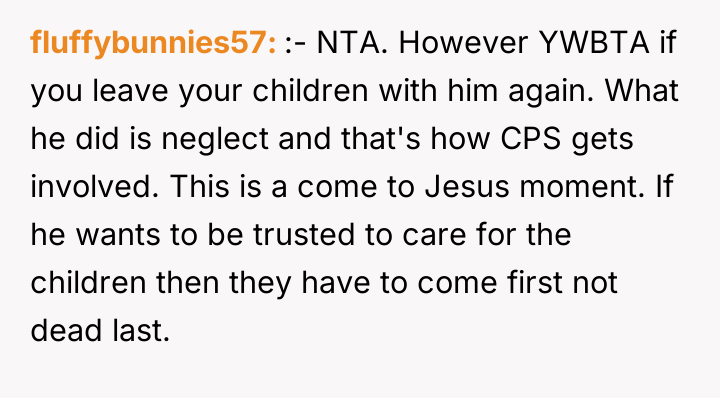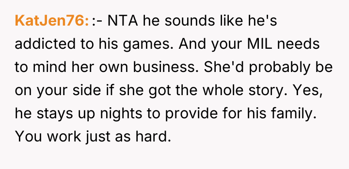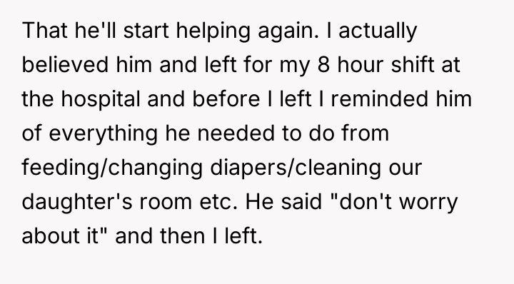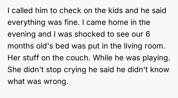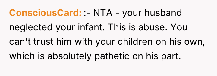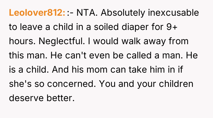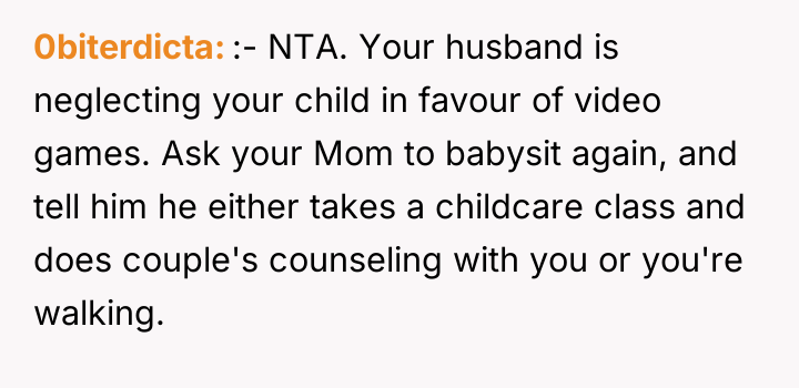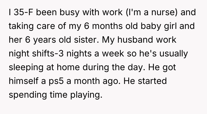 As renowned researcher Dr. Brené Brown explains, “Boundaries are the distance at which I can love you and me simultaneously.” This situation highlights a severe breakdown in relationship boundaries, where the husband's self-care (playing video games) is actively infringing upon the fundamental care responsibilities owed to his children, directly impacting the wife's capacity to manage her own demanding role as a nurse and mother. The husband’s behavior—using fatigue as an excuse while immediately engaging in a high-concentration activity like gaming, neglecting hygiene for the infant, and then blaming the OP for not reminding him—indicates a pattern of avoidance and poor accountability. His reaction to the OP seeking external help, and his mother’s subsequent defense, suggests an underlying dynamic where the husband’s leisure time is being protected, potentially through emotional manipulation or by minimizing the severity of the neglect. The OP's intense reaction was a predictable result of reaching a breaking point after repeated failures by her partner to uphold his responsibilities. The OP’s actions in correcting the immediate situation (caring for the baby) were appropriate given the emergency of neglect. However, moving forward, relying on reminders is unsustainable. A constructive recommendation is for the couple to formally establish non-negotiable childcare schedules that respect his sleep needs but mandate specific, accountable daytime duties when he is awake. If he cannot meet basic safety requirements, external support (like a daytime babysitter) should be considered a shared expense, not a last resort when he fails.