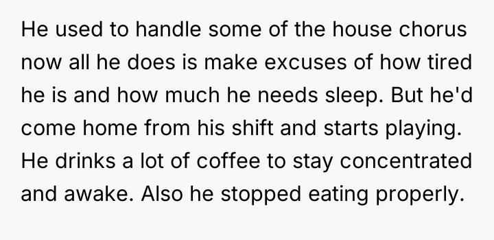 The original poster (OP) is facing significant exhaustion and distress due to the unequal division of labor, compounded by her husband's prioritization of leisure time over essential childcare duties. The central conflict lies between the OP's reasonable expectation of shared responsibility for their children and the husband's stated need for rest, which he appears to circumvent by engaging in gaming immediately after his demanding work shifts.