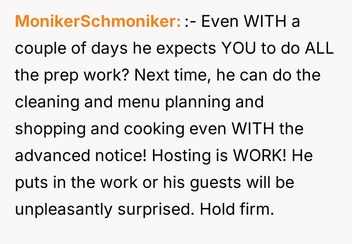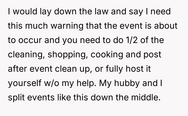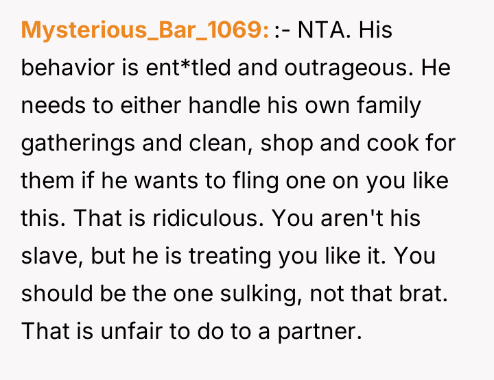 The original poster (OP) feels frustrated because their partner dismisses the impact of his judgmental family while simultaneously relying on the OP to manage all household preparations, leading to conflict when last-minute social plans arise. The central tension is between the partner's stated belief that family opinions do not matter and his subsequent behavior, which suggests their approval or presence heavily influences household planning and the OP's perceived obligations.