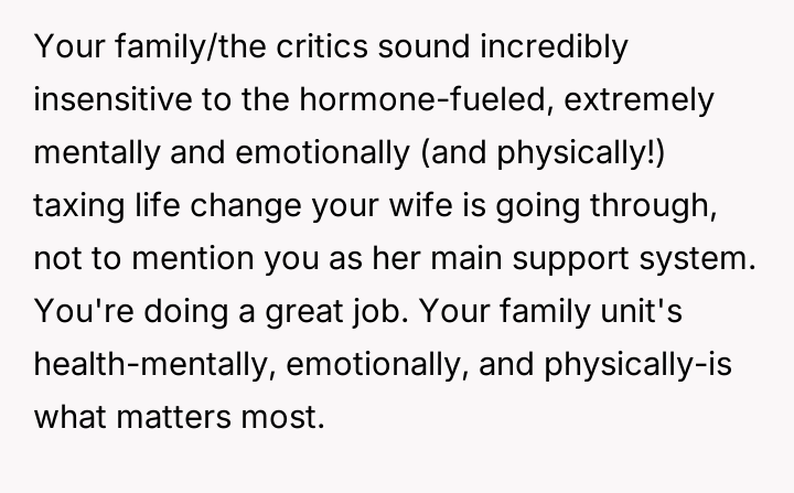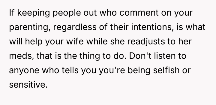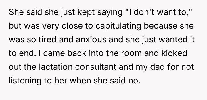 As renowned researcher Dr. Brené Brown explains, “Boundaries are the distance at which I can love you and me simultaneously.” This situation clearly illustrates a breakdown in respecting the boundaries established by the new parents, specifically concerning the wife’s deeply personal medical and physical choices immediately post-partum. The OP's wife experienced significant duress during pregnancy, leading to a mental health crisis and a clear decision against breastfeeding. When she vocalized this refusal in the hospital, the lactation consultant and the OP's father ignored her expressed wishes, demonstrating a profound lack of respect for her autonomy. The OP’s intervention was a necessary, albeit forceful, reassertion of his wife’s right to self-determination during a vulnerable time. Following this, the continued unsolicited critiques regarding parenting choices—feeding, holding, equipment—are another form of boundary violation, triggering the wife's existing anxieties related to maternal competence. The OP’s decision to temporarily restrict access for those who violated these boundaries is appropriate given the context of protecting his wife's recovering mental health. A constructive recommendation for handling future interactions would be to establish clear, proactive communication guidelines with all family members before visits. This communication should frame the rules not as punishments, but as necessary conditions for preserving the family unit's current stability, emphasizing that support means respecting established rules, not offering unsolicited advice.