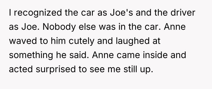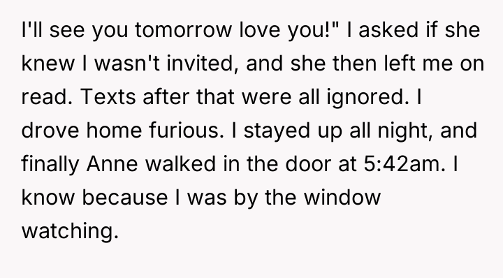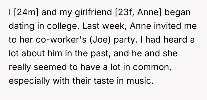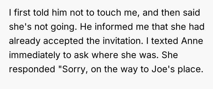 Joe explicitly told the OP that only Anne was invited to the subsequent gathering. When Anne confirmed she was going, she ignored the OP's subsequent texts asking for clarification. After Anne returned home in Joe's car very early the next morning, the OP ended the relationship immediately. The central conflict involves the OP's reaction to Anne prioritizing an invitation from Joe over his feelings, leading to the current dilemma of whether his response was justified.