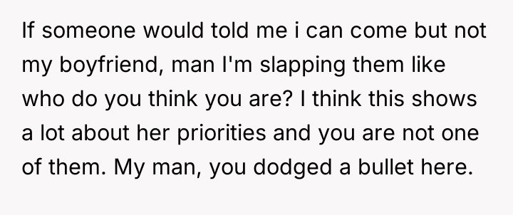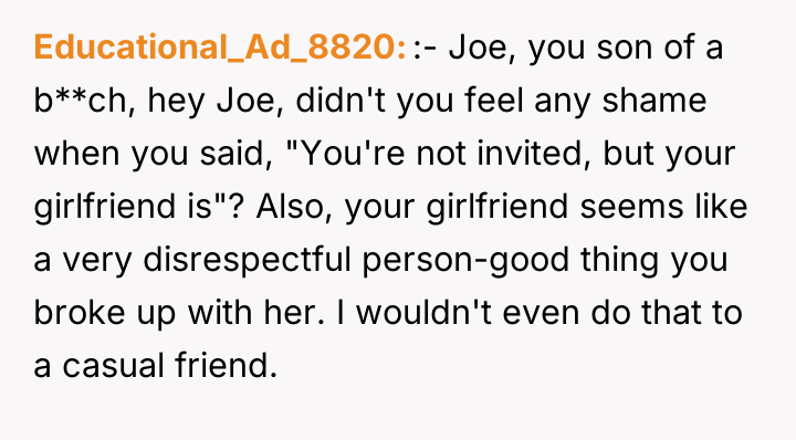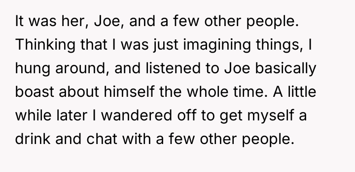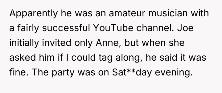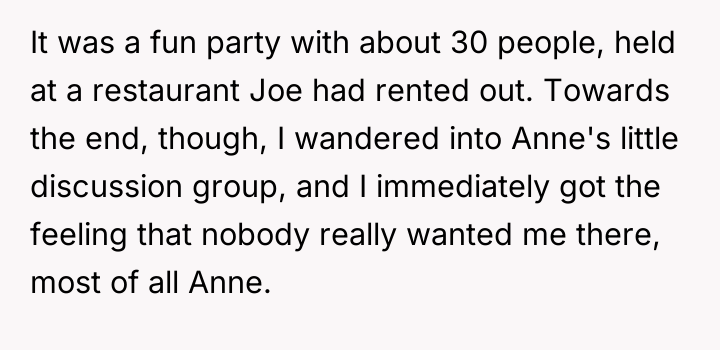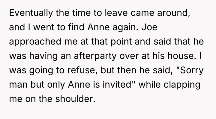 A 24-year-old man (OP) attended a party hosted by his girlfriend Anne's co-worker, Joe. Although Joe initially invited only Anne, he allowed the OP to attend when asked. During the event, the OP felt excluded, particularly when Anne was engaged in a discussion group with Joe and others. The situation escalated when Joe announced an afterparty at his house.