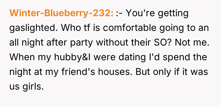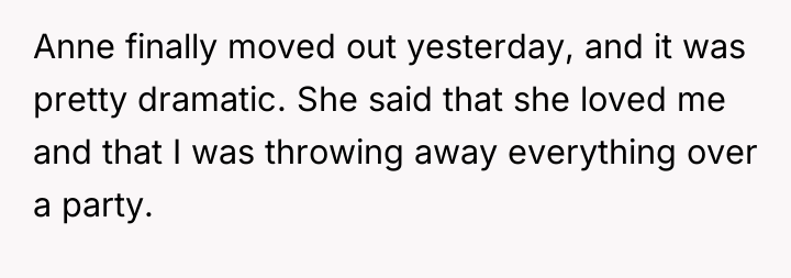 The OP is currently dealing with the fallout of ending a relationship based on feelings of exclusion, boundary violations, and perceived infidelity regarding the afterparty invitation. Anne views the breakup as an extreme overreaction to a simple social event, suggesting the OP's actions stem from insecurity, while the OP feels justified in setting a firm boundary against what he perceived as disrespectful behavior.