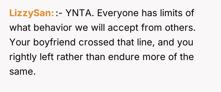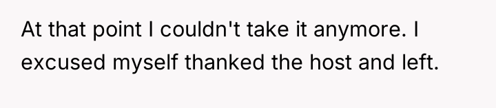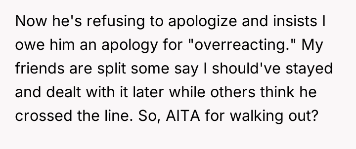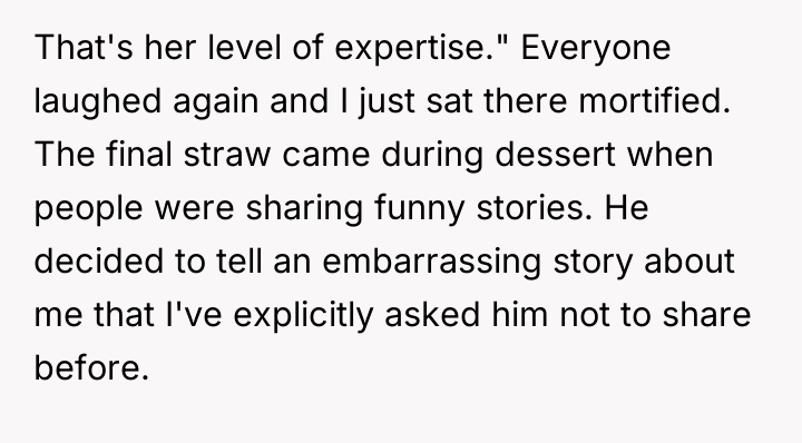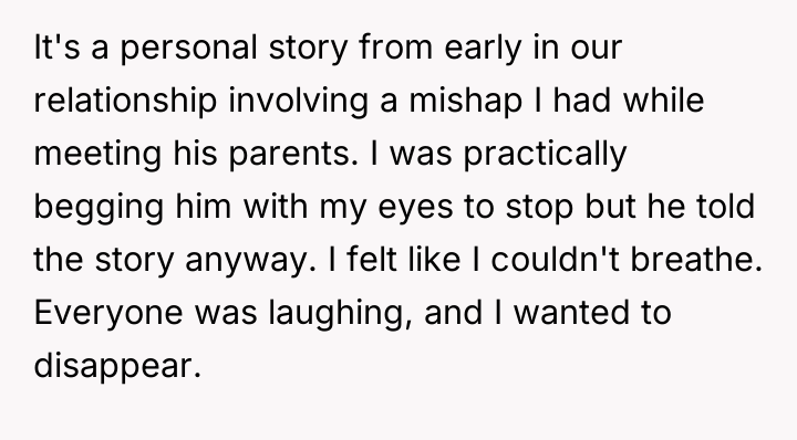 The situation worsened when the boyfriend interrupted OP and later shared a deeply personal and embarrassing story about her, despite her non-verbal pleas for him to stop. Feeling mortified and unsupported after he dismissed her concerns, OP chose to leave the event abruptly. The immediate aftermath involved the boyfriend becoming furious, accusing OP of embarrassing him and being too sensitive, leading to a standoff where he demands an apology from her.
