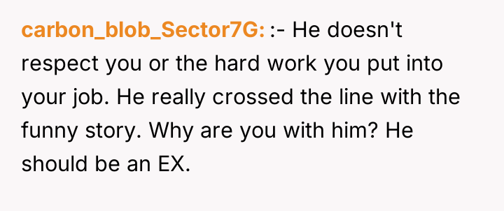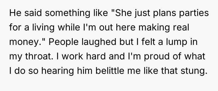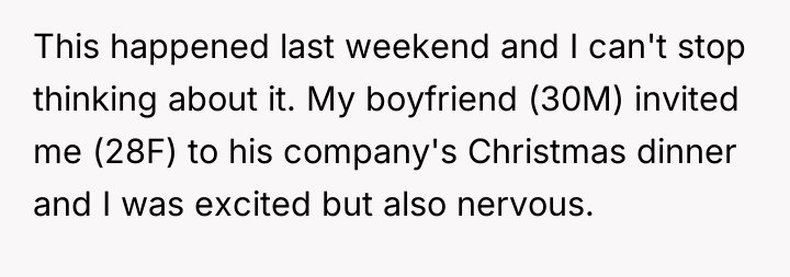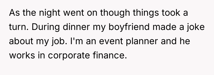 The Original Poster (OP), a 28-year-old woman, attended her 30-year-old boyfriend's company Christmas dinner, aiming to make a positive impression. During the evening, the boyfriend began making dismissive and demeaning comments about OP's career as an event planner, comparing it unfavorably to his work in corporate finance.