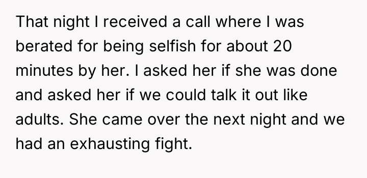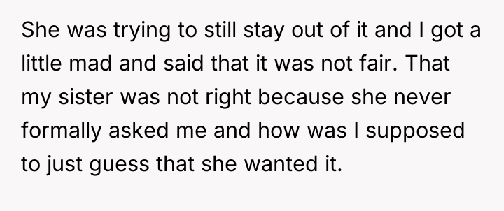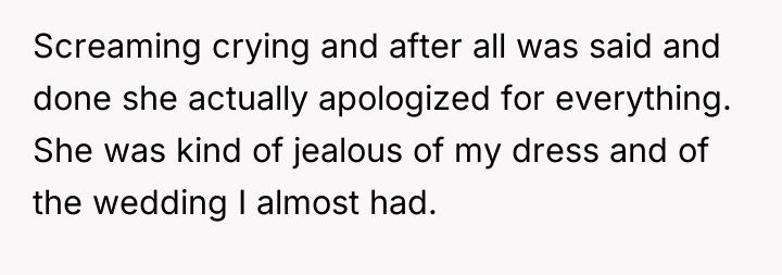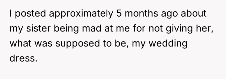 The original poster (OP) found herself in a difficult situation where her sister expressed anger over the OP's wedding dress, which the sister had presumed would be given to her. Despite the sister's initial harsh reaction and avoidance, the conflict was eventually resolved through a difficult conversation where the sister confessed deep-seated feelings of jealousy and inadequacy regarding her own financial status and perceived life achievements.