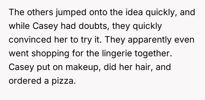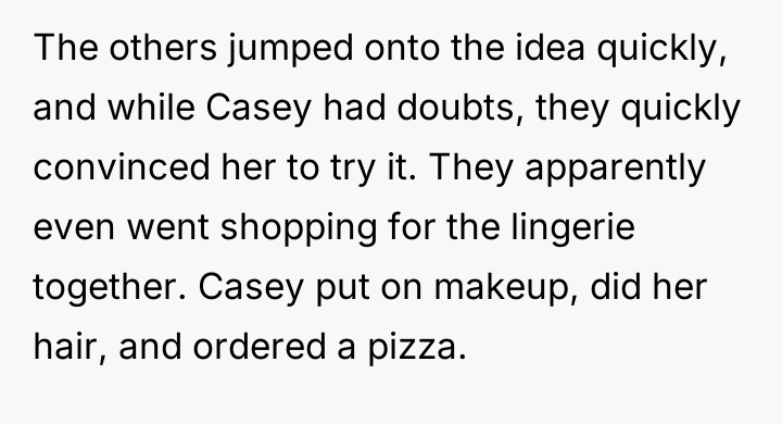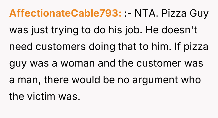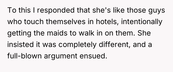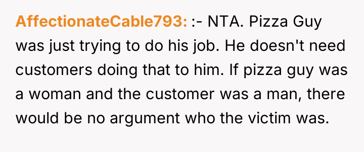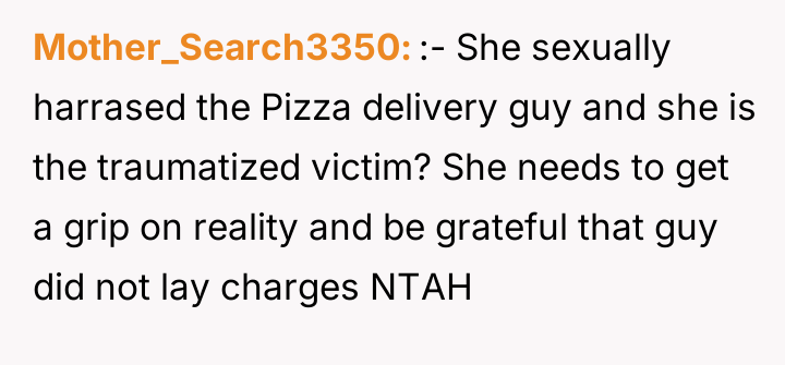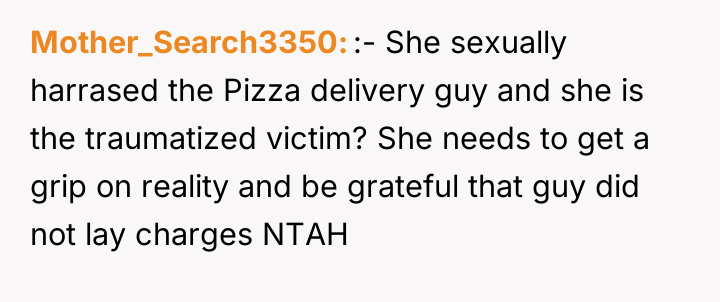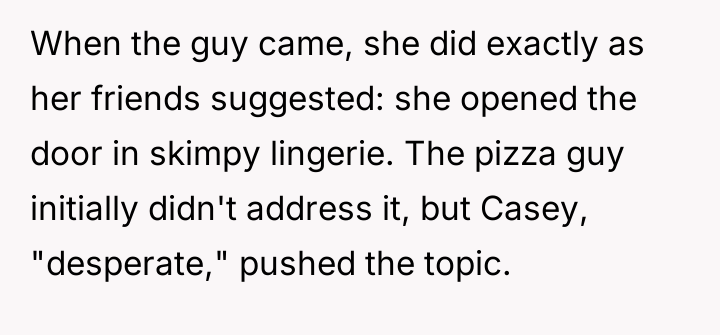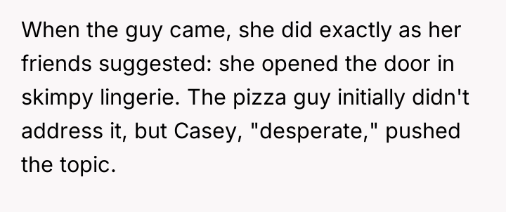 The plan backfired when the delivery driver reacted negatively, telling her to stop. When Casey later recounted this story to her boyfriend seeking comfort, OP responded by labeling her the 'perpetrator' of sexual harassment, comparing her actions to inappropriate public exposure. This caused Casey to become highly upset, leading to a significant argument where she insisted she was the victim, leaving OP confused about his reaction.