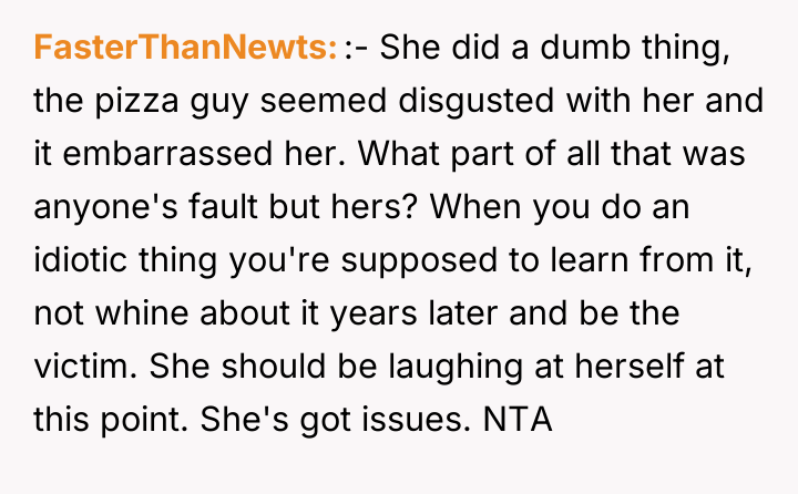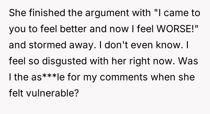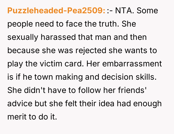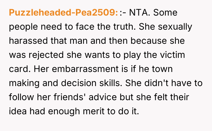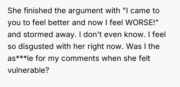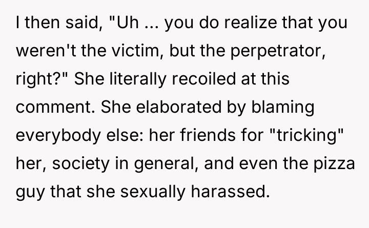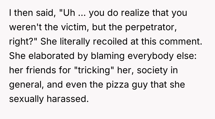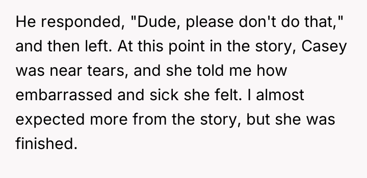 According to Dr. Remy Gray, a specialist in interpersonal conflict and boundary formation, "When one party discloses a past event seeking emotional repair, the listener's primary role shifts temporarily from objective judge to supportive confidant. Introducing moral critique too early can shatter the fragile trust required for vulnerable sharing." OP's reaction, while stemming from a valid ethical standpoint—that Casey's actions constituted harassment—failed to meet the immediate need of the moment, which was emotional processing. Casey's subsequent defensiveness and refusal to accept responsibility highlight a common defense mechanism where individuals externalize blame to protect their self-concept from painful realizations. Her friends were enablers in pressuring her into an inappropriate situation, but the act itself was initiated by her. While OP was not wrong to identify the problematic nature of the past behavior, the delivery was counterproductive. A more effective approach would have been to first validate her current feelings of embarrassment and sickness—acknowledging that being rejected was painful—before gently introducing a discussion about agency and responsibility at a later, less charged time. OP should focus on setting clear boundaries for future interactions now, rather than re-litigating past guilt.