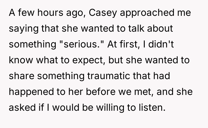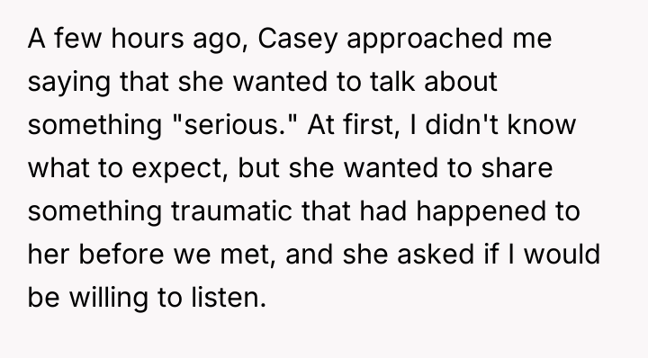 The situation forces a difficult choice between validating a partner's emotional pain during disclosure and holding firm to one's ethical assessment of behavior. The central question remains: Should OP prioritize immediate emotional support for Casey, even if it means sidestepping his discomfort with her past actions, or was his blunt assessment necessary despite causing her distress in that moment?