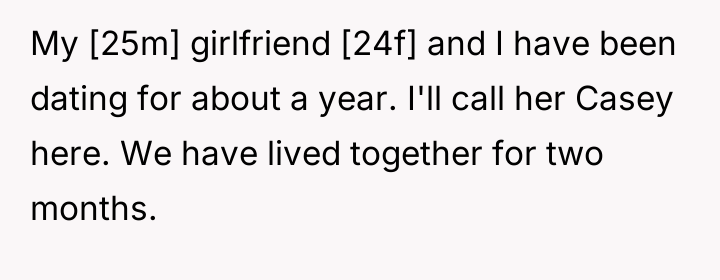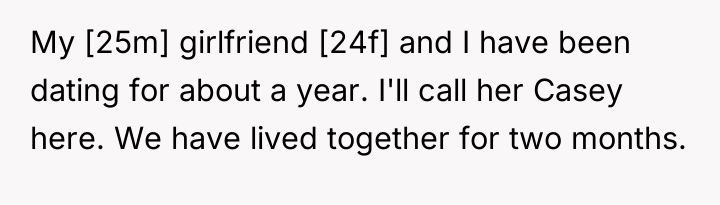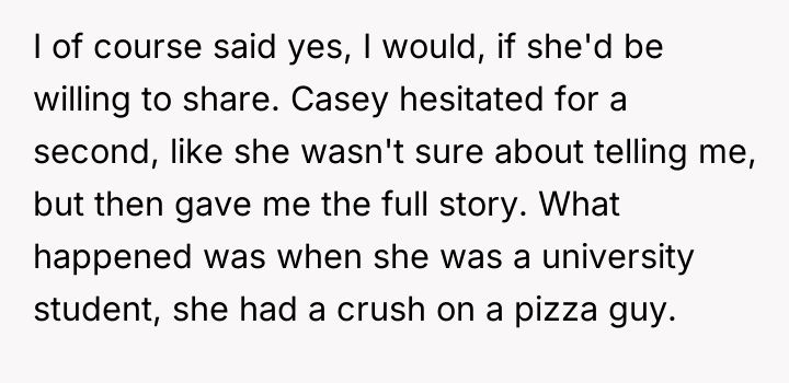A man, referred to as OP (25m), and his girlfriend, Casey (24f), who have lived together for two months, were involved in a serious discussion after Casey chose to share a past traumatic event from her university days. Casey explained that she had developed a crush on a pizza delivery driver and, encouraged by her friends, decided to answer the door wearing revealing lingerie in an attempt to get his attention.