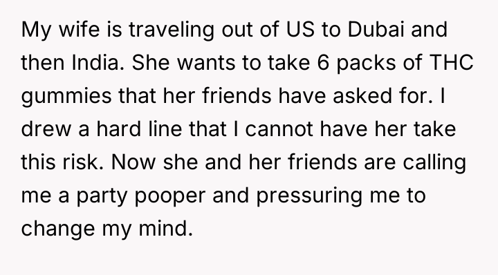 The Original Poster (OP) is facing a conflict with his wife regarding the transport of illegal substances across international borders. His wife plans to travel from the US to Dubai and then to India, intending to carry six packs of THC gummies for her friends.