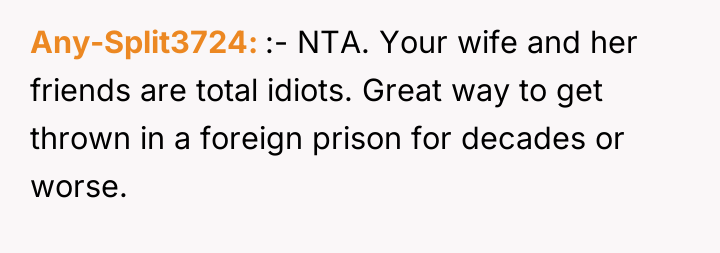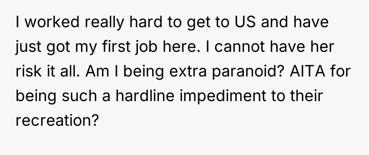 The OP has firmly stated that he will not allow her to take this risk due to the serious legal consequences involved, especially given his recent arrival and first job in the US. In response, the wife and her friends are pressuring the OP, labeling him a "party pooper" and demanding he change his firm position. The OP is now questioning if his concern is excessive and whether he is unfairly blocking his wife's recreational plans.