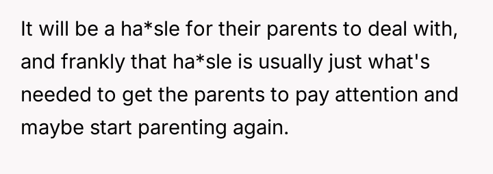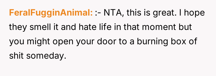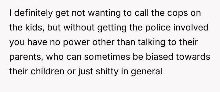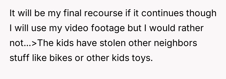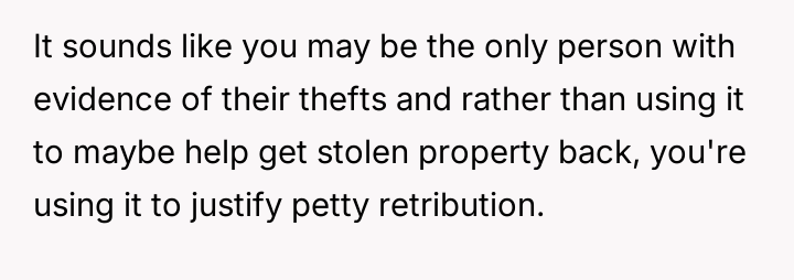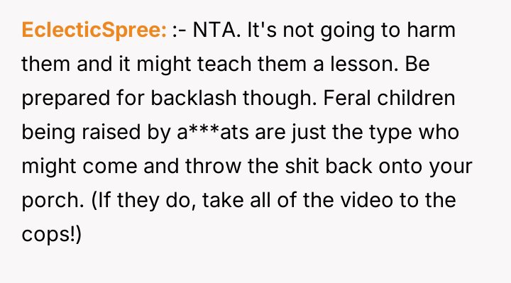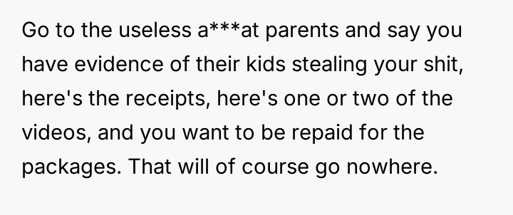 As renowned family therapist and author, Dr. Terrence Real, states, “When we don't assert our boundaries, we are implicitly saying that other people’s behavior doesn't matter to us.” This sentiment applies to the OP's initial situation, where the repeated theft indicated a complete lack of respect for their property, and the failure of external authorities (parents/police) to intervene left the OP feeling powerless to establish necessary limits. The OP’s reaction, while stemming from a place of justifiable anger and boundary violation, is a clear example of attempting to enforce informal justice through indirect, retaliatory means rather than formal or direct communication. Filling packages with excrement moves the action from personal defense into harassment or property damage, depending on jurisdiction. While the intent was to deter future theft by creating a memorable, negative consequence—a form of negative conditioning—this method bypasses effective conflict resolution. It assumes the perpetrators will learn a lesson about property rights, rather than simply learning that the victim is unpredictable or retaliatory. The OP’s action was inappropriate due to its extreme and unsanitary nature. A more constructive recommendation would have been to focus on escalating formal reporting (e.g., filing a police report despite initial reluctance, as property theft is a crime) or attempting one final, documented communication directly with the parents stating the next step would be formal legal action, rather than resorting to personal, offensive retaliation.