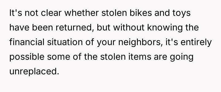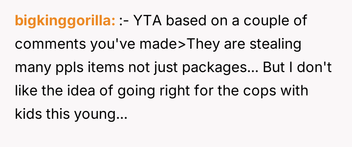 The original poster (OP) acted out of frustration and a desire for retribution after experiencing repeated theft and failing to find support through official channels like involving the police or contacting unresponsive parents. This led the OP to take matters into their own hands by creating bait packages containing waste, directly conflicting with societal norms regarding appropriate responses to minor property crime involving children.