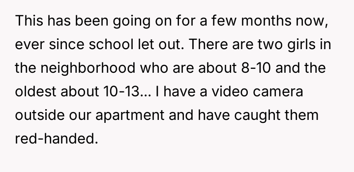 In a quiet neighborhood, a string of petty thefts has left one resident both frustrated and determined. For months, mysterious packages have vanished from outside an apartment, stolen by two young girls whose careless actions have sparked a silent war of wills. With each stolen item, the tension grows, blending anger with a desperate hope to teach a lesson without involving harsh consequences.
