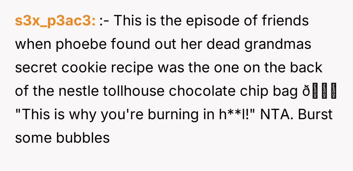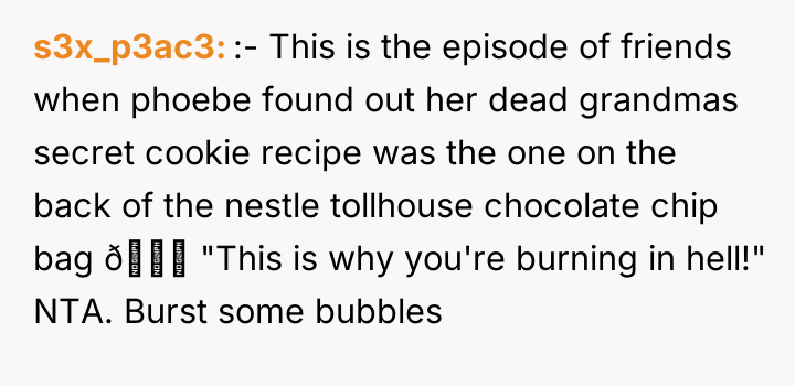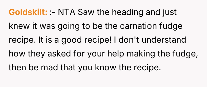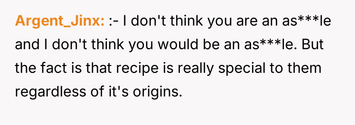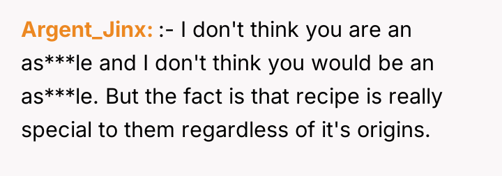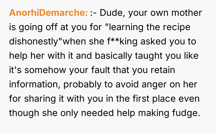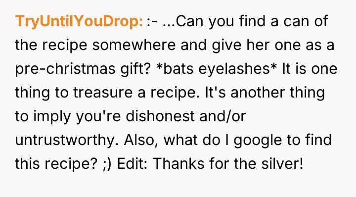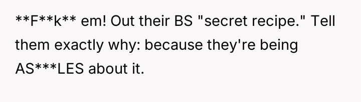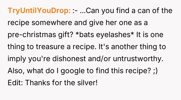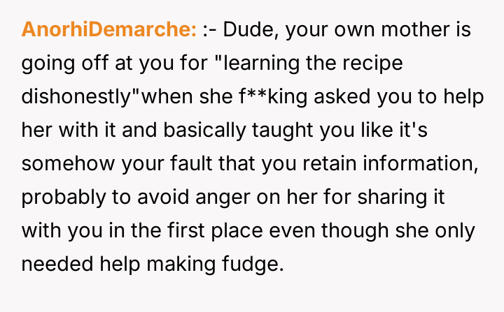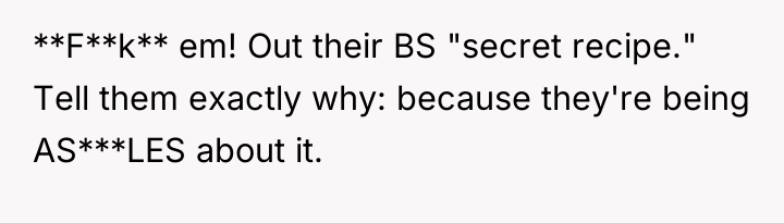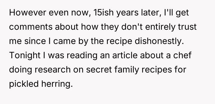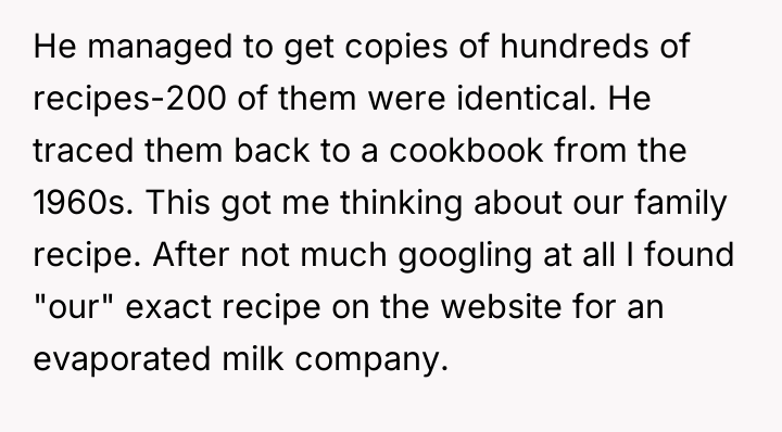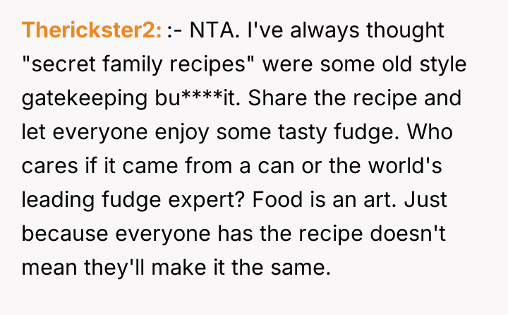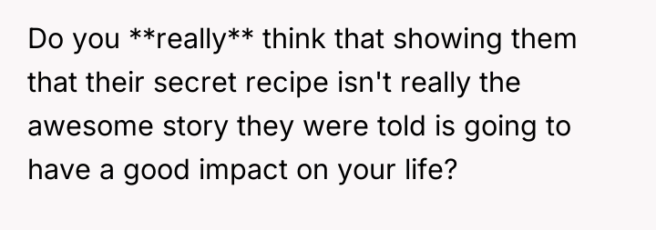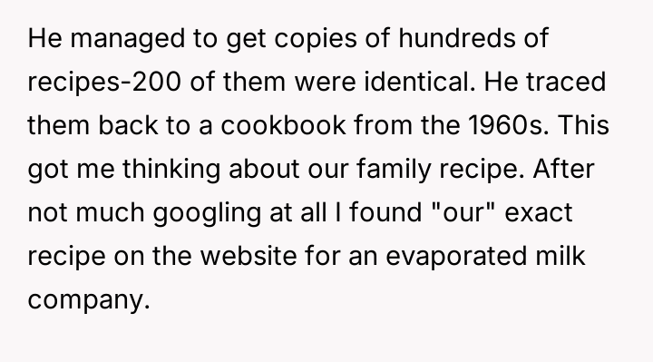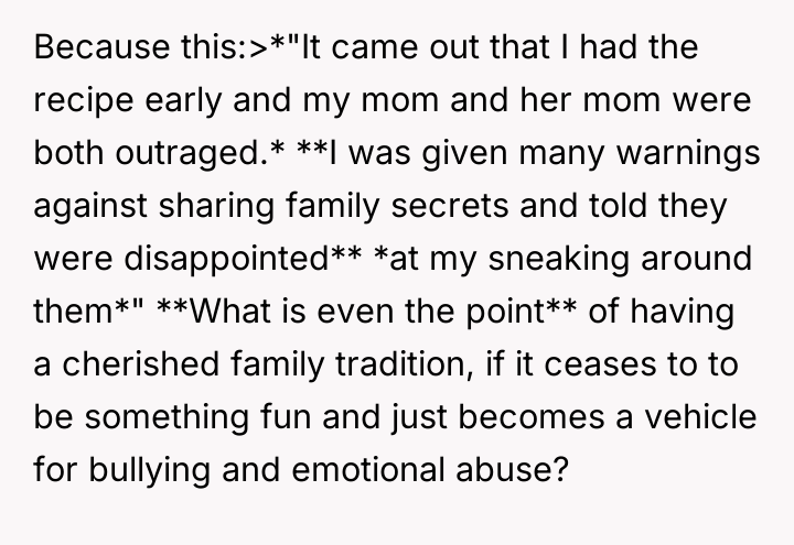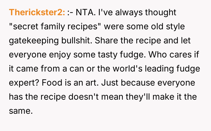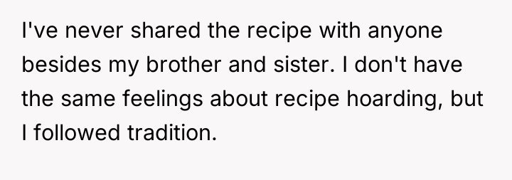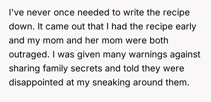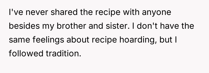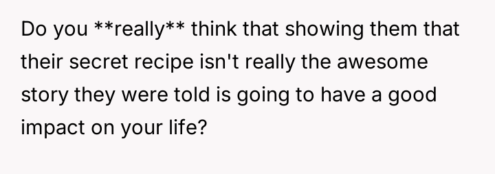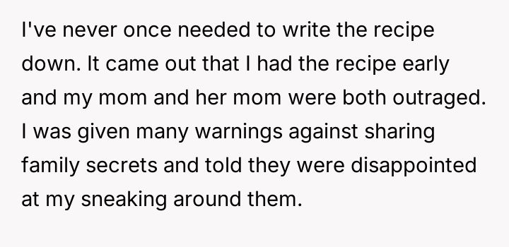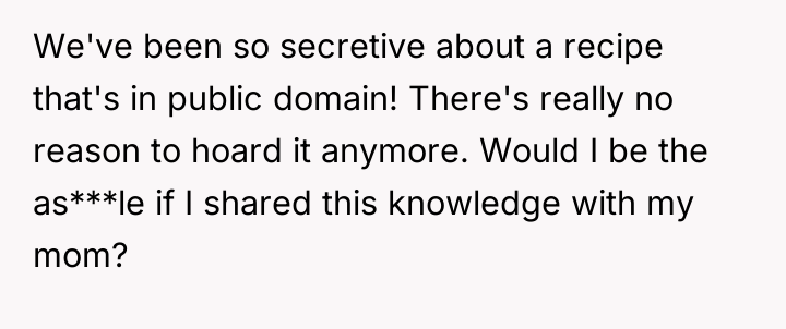 As renowned organizational psychologist and communication expert Dr. John Gottman explains, "Good communication does not mean that you never have disagreements, but that you have it in a way that you respect each other’s opinions." The core conflict here revolves around perceived betrayal versus perceived absurdity. The mother and grandmother attached significant emotional and relational value (family legacy, trust, tradition) to the recipe, regardless of its actual origin. The OP's transgression was not in learning the recipe, but in circumventing the established 'gatekeeping' rules set by the older generation, which they interpreted as dishonesty. The OP’s current motivation is to correct a factual error (the secret origin) and relieve the associated tension, viewing the situation through a lens of practicality and objective truth. Sharing the public domain information will likely serve as a dramatic revelation that validates the OP's suspicions but may still feel like a final, aggressive act of 'winning' against the older generation's control, rather than a gentle correction. A more constructive approach would be to initiate a conversation focused on the *meaning* of the secret, rather than just the fact of its origin. The OP could frame the discovery as an opportunity to redefine family traditions going forward, perhaps suggesting they all cook the now-public recipe together, shifting the focus from past secrecy to future shared experience.