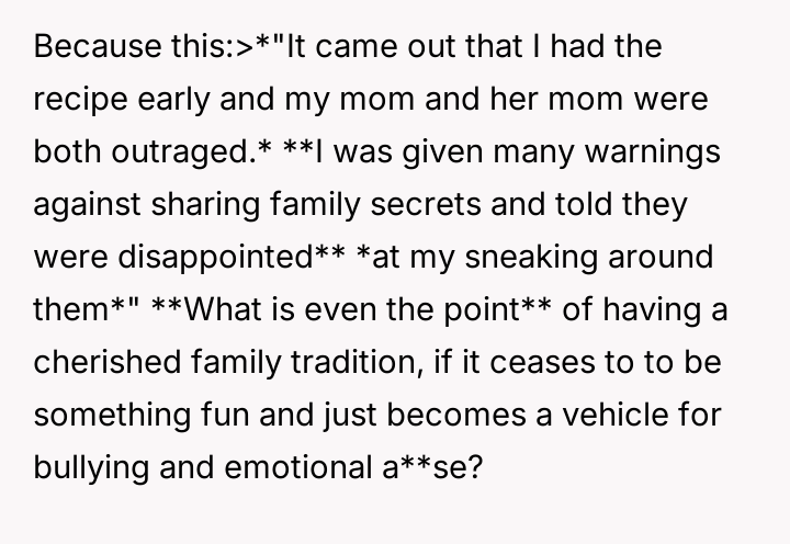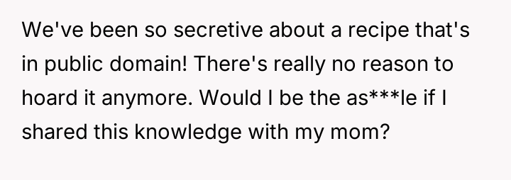 The original poster (OP) feels validated in their desire to share a long-held family secret after discovering the recipe is publicly available. This clashes directly with their mother's and grandmother's established belief system regarding the recipe's exclusivity and the moral failing associated with how the OP first obtained it.