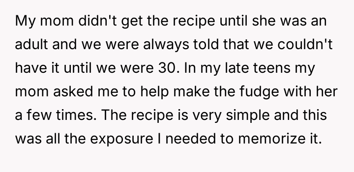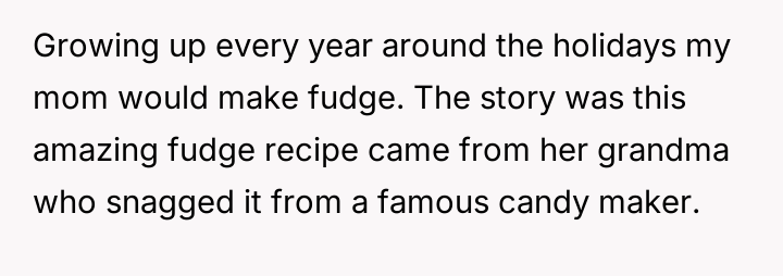Every holiday season, the rich aroma of fudge filled the house—a sacred tradition pa*sed down through generations, wrapped in secrecy and guarded by a promise: the recipe would remain hidden until the age of thirty. This was more than just a sweet treat; it was a legacy, a symbol of trust and family bonds, carefully preserved by a grandmother who had stolen it from a famous candy maker, and fiercely protected ever since.