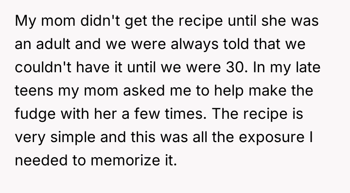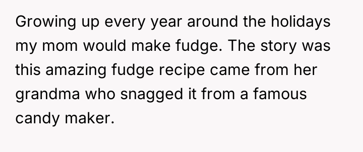 Every holiday season, the rich aroma of fudge filled the house—a sacred tradition passed down through generations, wrapped in secrecy and guarded by a promise: the recipe would remain hidden until the age of thirty. This was more than just a sweet treat; it was a legacy, a symbol of trust and family bonds, carefully preserved by a grandmother who had stolen it from a famous candy maker, and fiercely protected ever since.