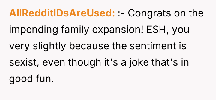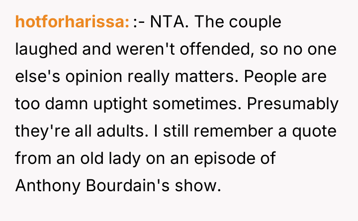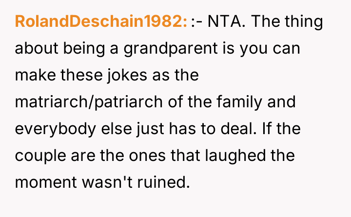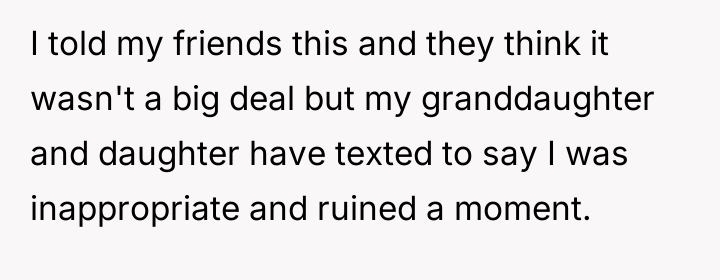 The original poster (OP) intended to share a humorous, albeit crude, saying with their family to celebrate a happy occasion, reflecting their own jovial nature and relationship with their close friends. However, this action resulted in significant emotional distress and criticism from their daughter and granddaughter, who viewed the comment as inappropriate and damaging to the celebratory moment.