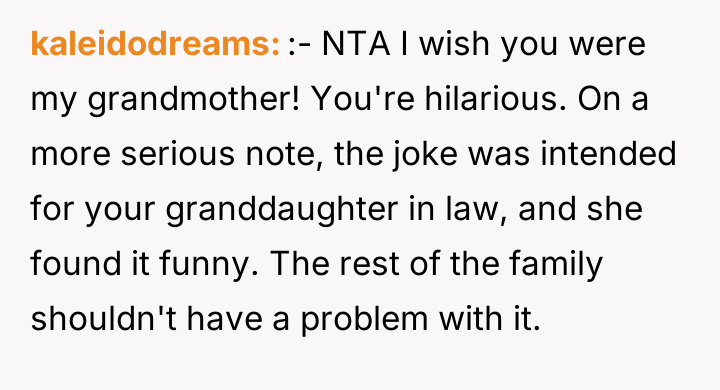 As renowned family therapist Dr. Harriet Lerner explains, “Boundaries are not about controlling other people; they are about taking responsibility for our own choices.” The situation highlights a conflict between personal expression (the OP's sense of humor) and social context (the solemnity often afforded to engagement announcements). The OP operates from a baseline where dark humor is accepted by their peers. In contrast, the daughter and granddaughter appear to value decorum and propriety in significant family milestones, suggesting differing generational or personal thresholds for 'appropriate' behavior. The OP's motivation was likely lighthearted bonding, but they failed to gauge the audience's readiness for that specific type of humor, especially in front of the newly engaged couple who may have felt immense pressure or awkwardness. The OP’s actions, while stemming from humor, were inappropriate for the specific social setting because they imposed their preferred communication style onto a moment primarily centered on another couple's transition. A constructive approach would involve the OP recognizing that different life stages and events call for shifting communication styles. In the future, the OP should prioritize observing the immediate mood and the presence of sensitive parties before deploying jokes that rely on potentially offensive or highly personal subject matter.