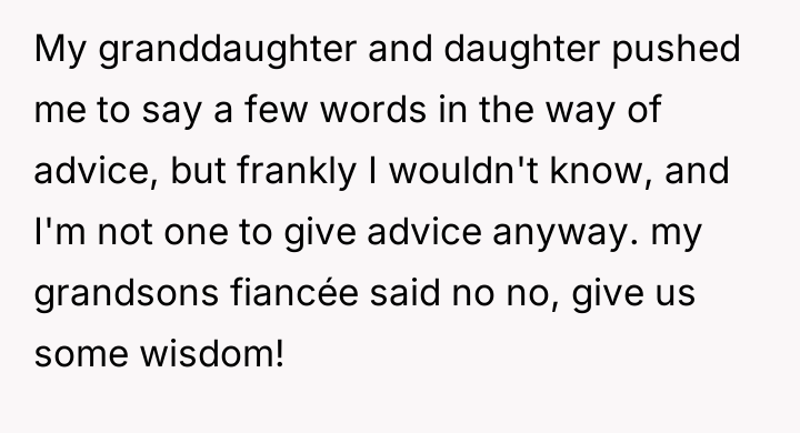 When the next generation gathered to celebrate a new beginning, that same irreverent humor bridged the gap between youth and age. Amidst the warmth of family and the sparkle of new love, a single phrase sparked genuine laughter and honest connection, proving that wisdom doesn’t always come cloaked in solemnity—it often arrives with a wink and a smile.