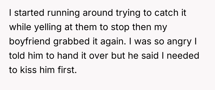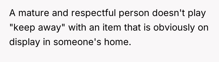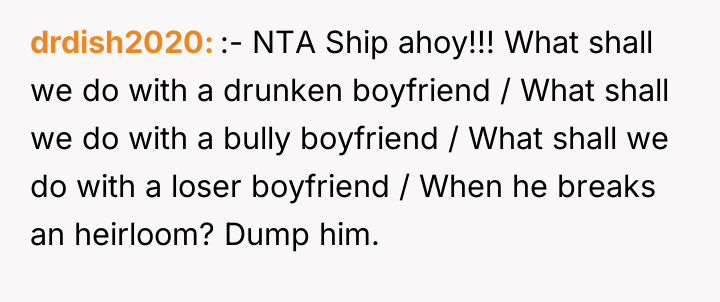 As renowned relationship expert Dr. John Gottman explains, “The most important thing in the world is to be able to talk to each other about what is important to you.” This situation highlights a severe breakdown in both communication and boundary setting. The boyfriend’s actions—engaging in high-risk, destructive behavior (throwing pillows, playing keep-away with a fragile object) while intoxicated—demonstrate a clear lack of respect for the OP's home and property. His demand that the OP 'kiss him first' to retrieve the item escalates the situation from mere recklessness to emotional manipulation, transforming a sentimental object into a bargaining chip. The OP’s initial failure to communicate the ship’s profound sentimental value (and perhaps its monetary value) left the boyfriend unaware of the stakes. However, once she explicitly stated its importance, his continued insistence on justifying the destruction based on his intoxication and her silence places the blame externally rather than taking responsibility for the damage caused. The OP’s reaction—demanding $3,500 and threatening legal action—while understandable given the emotional trigger, appears disproportionate to the relationship context (only six months). While the boyfriend is unequivocally at fault for the destruction, a more constructive approach would involve clear communication about the irreplaceable sentimental loss first. Professionally, the OP was appropriate in demanding accountability for the damage, but escalating immediately to a potentially relationship-ending legal threat is premature. A recommendation for the future would be to separate the discussion: first, address the breach of trust and the loss; second, agree on a fair, non-legal compensation plan that acknowledges both the monetary value and the sentimental void.