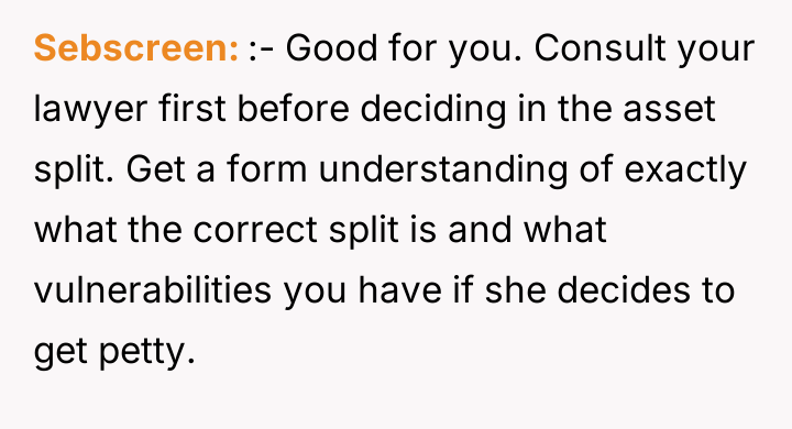 Given the OP's readiness to proceed and his strategic plan for asset division, the core debate for the reader is whether the OP was justified in seeking immediate divorce proceedings after only a few days of separation, or if he should have attempted mediation before escalating to legal action. Should his newfound peace outweigh the need for further reconciliation attempts?