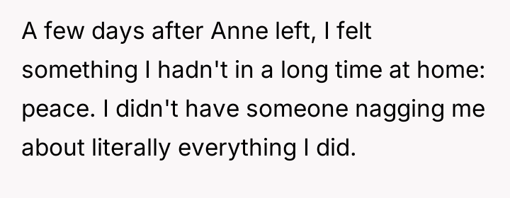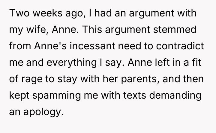 The story involves the OP and his wife, Anne, who recently had a major argument. The conflict began because the OP felt constantly criticized by Anne regarding minor daily habits, such as how he ate his meals or personal hygiene routines. Following this argument, Anne left their home to stay with her parents.