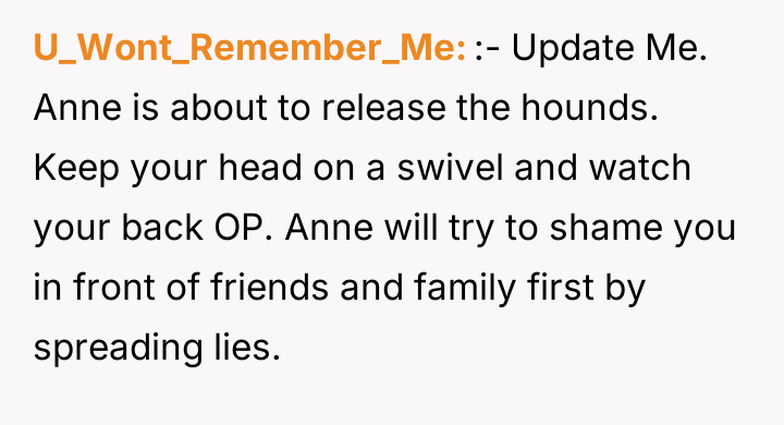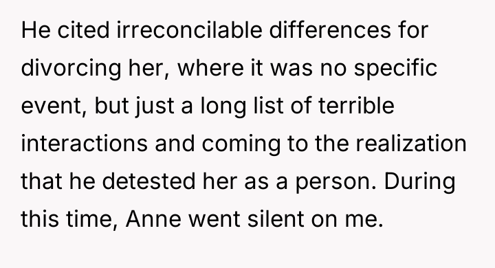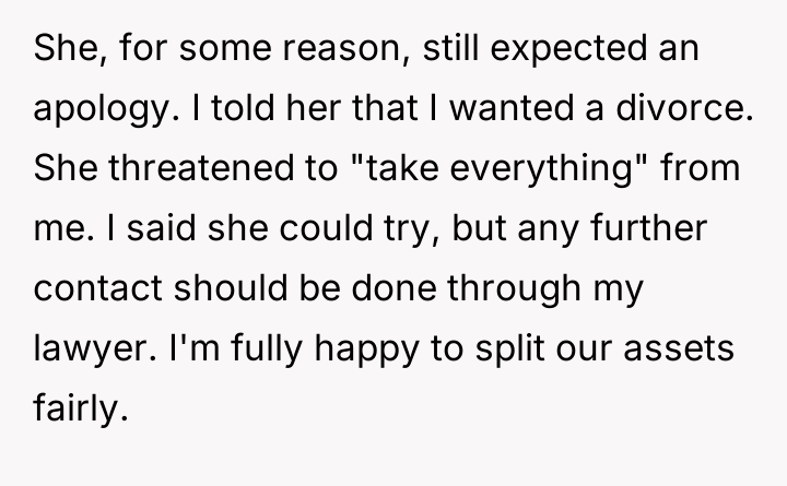 Anne immediately started pressuring the OP via text messages, demanding an apology. However, the OP experienced significant relief and peace in her absence, realizing how stressed he felt when she was present. This realization led the OP to investigate divorce proceedings, leaving him with the central question of how to proceed with ending the marriage despite Anne's threats.