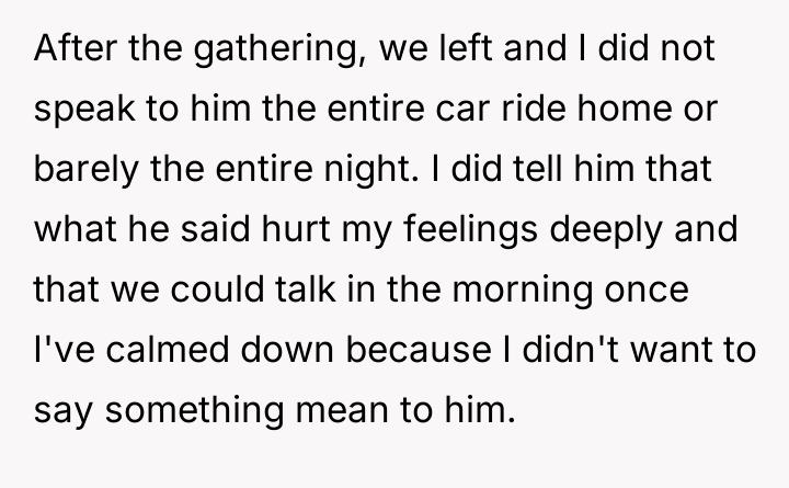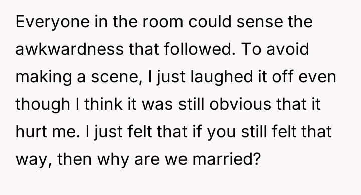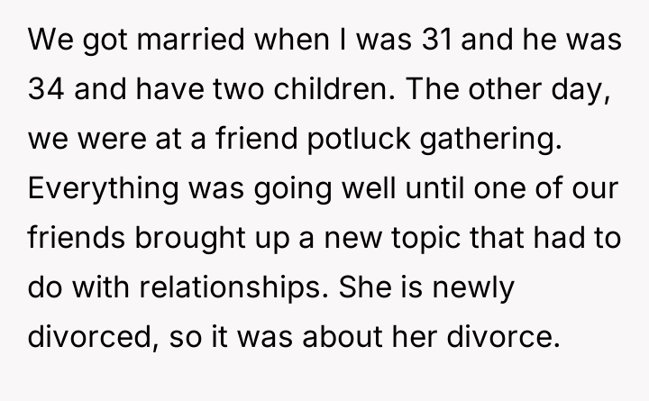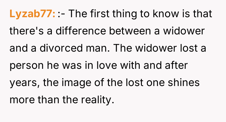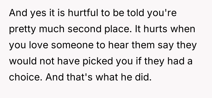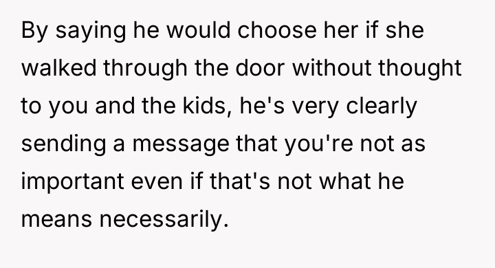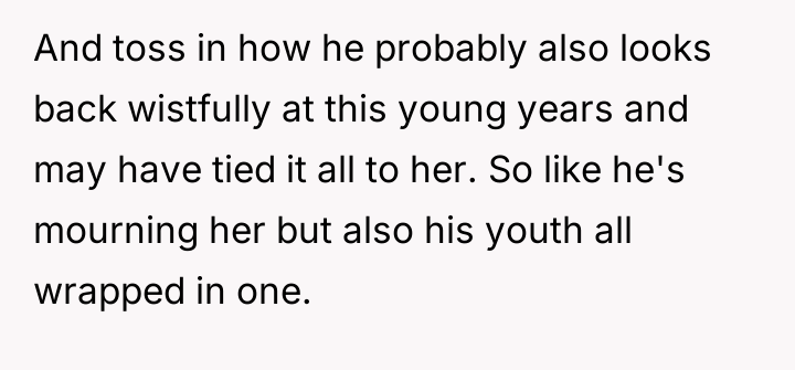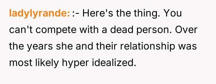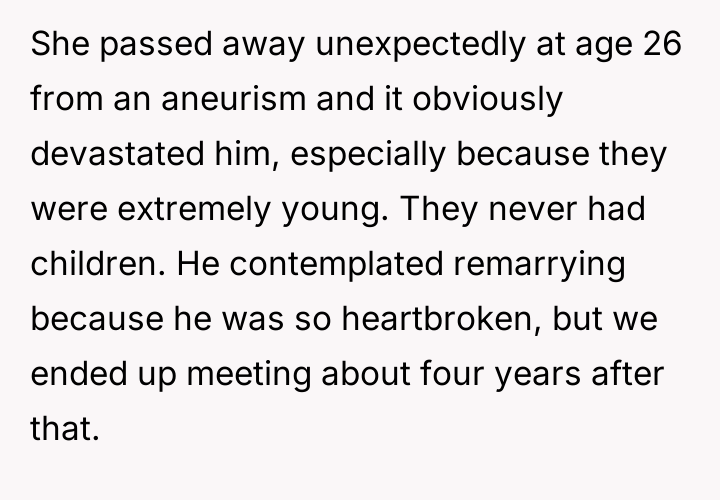 The husband's statement, "If she walked through that front door right now, I’d pick up where we left off," is an extreme expression of complicated grief, likely intensified by the tragic and sudden nature of his first wife's death when they were very young. While it is entirely normal and healthy for him to remember his first wife fondly, expressing an absolute willingness to abandon his current marriage (and two children) for a deceased person crosses a critical boundary. This action dismisses the OP's present emotional reality and commitment, making her feel secondary. The OP's reaction—hiding her pain to avoid a scene—is a common de-escalation strategy, but it prevents necessary resolution and allows the husband to remain unaware of the severity of his transgression.