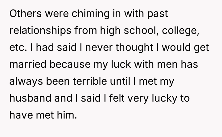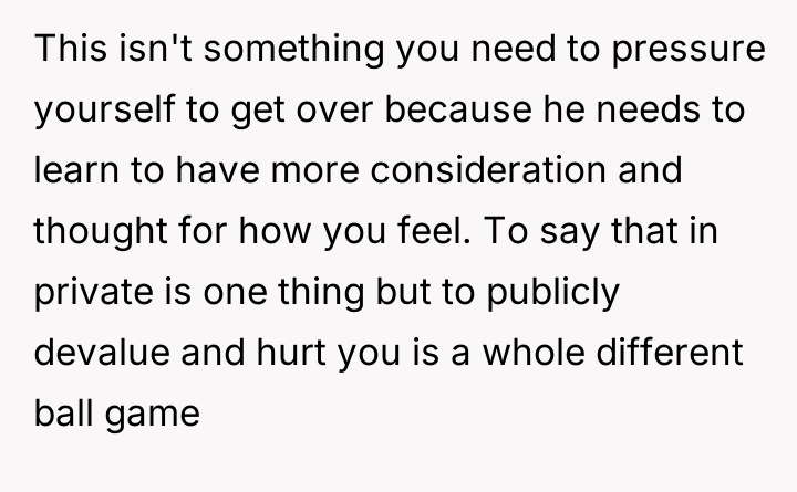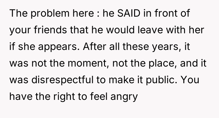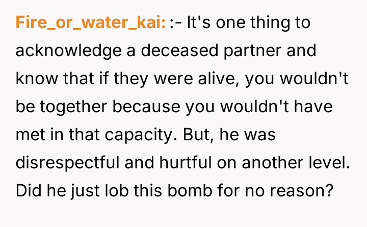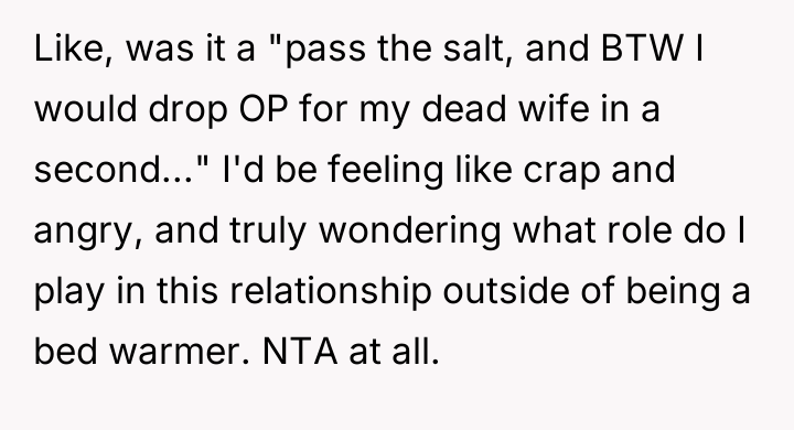 The OP's feelings are entirely appropriate; a spouse should not be emotionally compared to a deceased partner in a way that invalidates the present relationship. The constructive path forward requires the husband to acknowledge that his statement was deeply damaging and to commit to understanding the impact of his unresolved grief on his current family. For future similar situations, the OP should practice assertive, timely communication, stating clearly that while she respects his past, statements that undermine their marriage's primacy are unacceptable and require immediate, private discussion, rather than waiting for the next public incident.