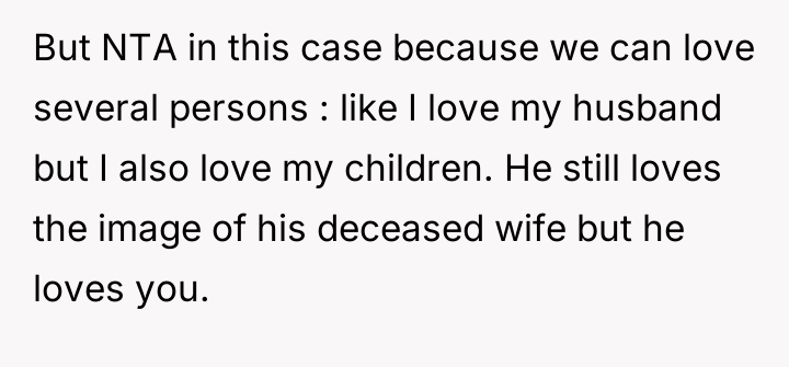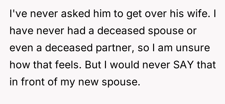 Should the OP prioritize protecting her husband from confronting his unresolved grief, or is her pain and the perceived threat to her current marital standing justification enough to demand clarity and boundaries regarding his public statements? The core question remains: How does one navigate the emotional space left by a deceased spouse when building a new, committed life?