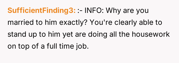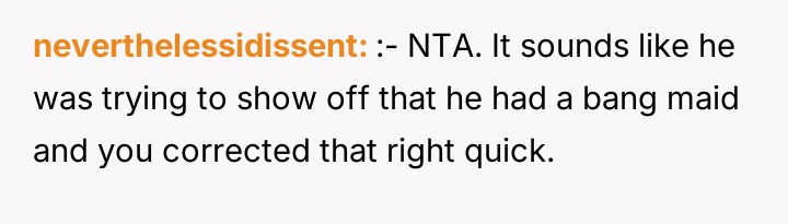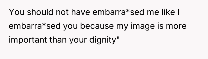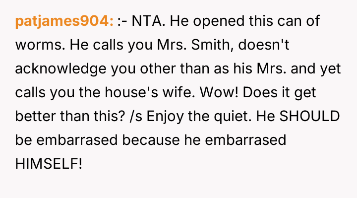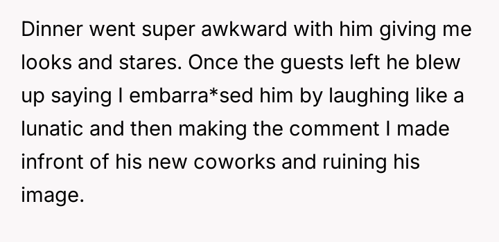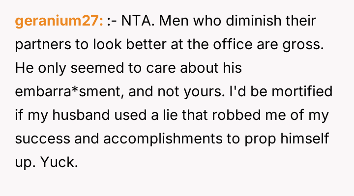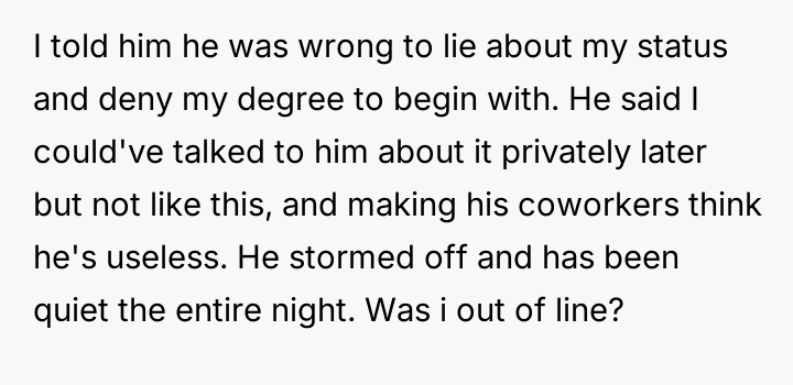 As renowned researcher Dr. Brené Brown explains, “Boundaries are the distance at which I can love you and me simultaneously.” The husband’s action of introducing his wife with a dismissive title (“the housewife”) and omitting her name serves several potentially damaging functions: it reduces her professional identity to a stereotype, reinforces an outdated division of labor, and exerts a form of public control over her narrative. The OP's explosive reaction—hysterical laughter followed by a direct, accusatory statement about the division of labor—is a clear, albeit emotionally charged, attempt to immediately enforce a boundary regarding how she is presented to others. Her response targeted the dishonesty (lying about her status/degree) rather than just the domestic labor imbalance, suggesting the professional slight was the primary trigger. The husband's subsequent reaction focuses entirely on his damaged image in front of his new colleagues, framing the OP's actions as 'embarrassing' and 'lunatic.' This indicates a potential pattern of prioritizing external perception over internal marital respect. While direct confrontation in front of guests can create immediate social tension, the husband created the conditions for that tension by publicly misrepresenting his partner. A more constructive approach for the OP in the future might involve establishing clear agreements beforehand about how she wishes to be introduced, especially in professional settings. If such agreements are violated, addressing the issue immediately afterward, perhaps by saying, "I need to address what you said earlier when we are alone," allows for boundary setting without completely derailing a social event.