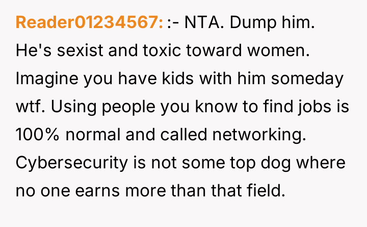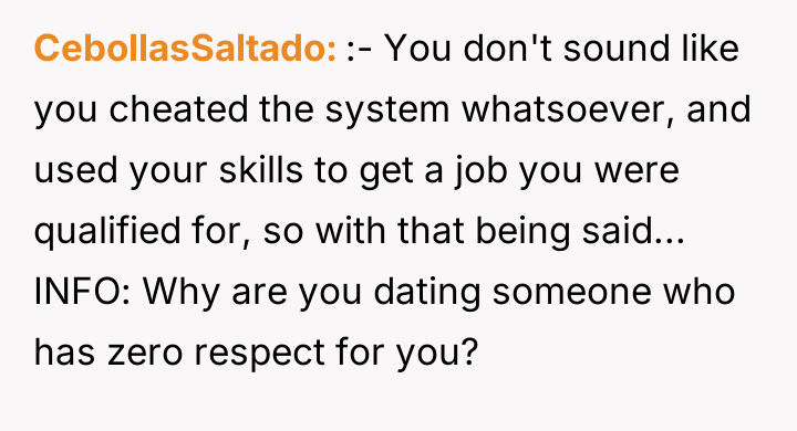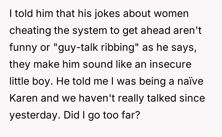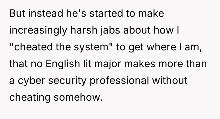 AITA for calling my boyfriend an insecure little boy after his repeated jokes that I "cheated the system" to get to a career that pays more than his?