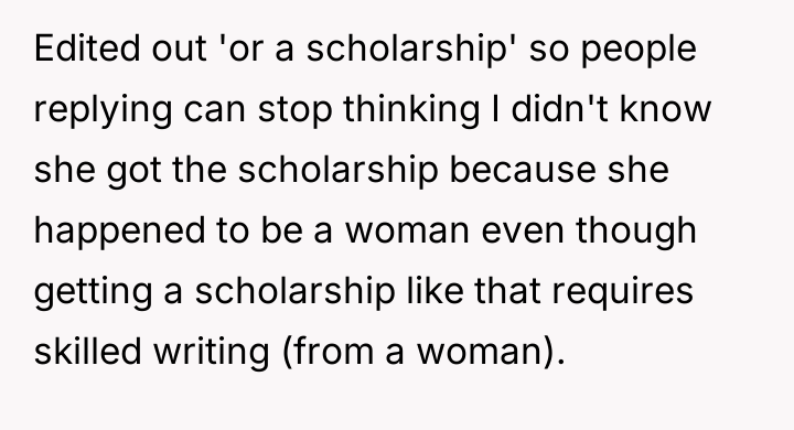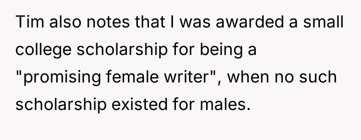 Is OP justified in confronting Tim so sharply regarding his comments about her career being based on 'cheating the system,' or did her response escalate the situation beyond a simple disagreement about gender dynamics and professional achievement?