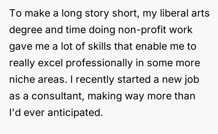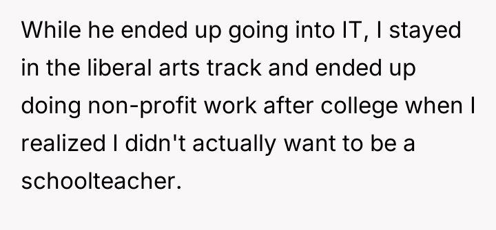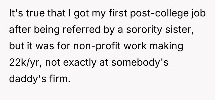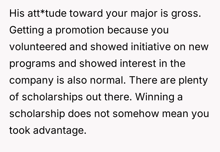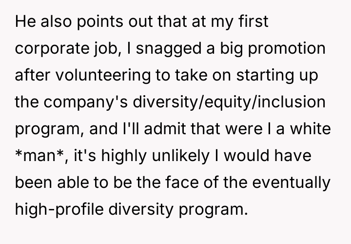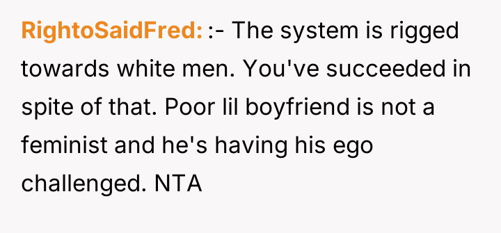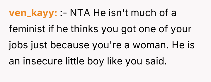 As renowned researcher Dr. Brené Brown explains, “Boundaries are the distance at which I can love you and me simultaneously.” In this scenario, the OP’s success has inadvertently exposed an existing vulnerability in the relationship's established power dynamic, causing Tim to erect defensive boundaries manifesting as aggressive critique. Tim’s behavior suggests deep-seated insecurity related to his perception of his own professional standing relative to the OP. While the OP’s career path involved leveraging networking (nepotism for a low-paying initial job) and advocating for social equity initiatives (DEI program), which are recognized, legitimate paths to advancement, Tim frames these as inherently illegitimate 'cheats.' This cognitive framing allows him to avoid confronting his own feelings of diminished status. The OP's response—calling him an 'insecure little boy'—while emotionally charged and likely accurate in expressing her frustration, crossed a relational boundary by attacking his character rather than focusing solely on the unacceptable nature of his sexist remarks. The OP’s actions in standing up to Tim’s undermining comments were appropriate in defending her integrity. However, to move forward constructively, she should separate the critique of his sexist comments from a personal attack. A better future approach would involve addressing the underlying relationship dynamic: establishing a clear boundary that career success, regardless of the mechanism, will not be a subject for derogatory 'jokes,' and then inviting Tim to discuss his feelings of inadequacy directly, rather than letting the resentment fester into attacks.