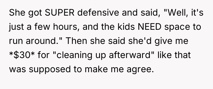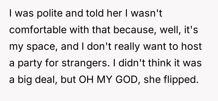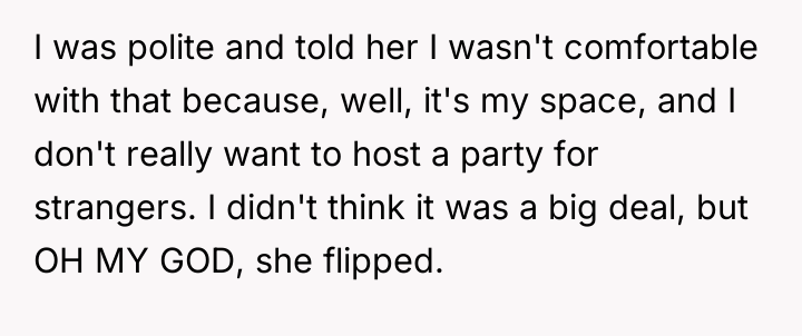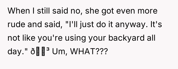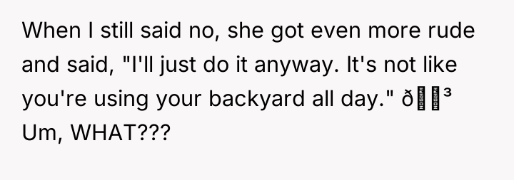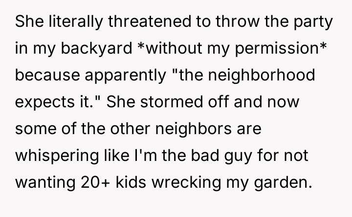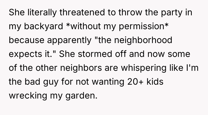 When the OP politely declined, stating she was uncomfortable hosting a large party for strangers in her private area, the neighbor reacted with extreme defensiveness. The neighbor offered a small sum of money for cleanup and then escalated by threatening to use the backyard regardless of the OP's wishes, claiming neighborhood expectations. The OP is now facing backlash from other neighbors and is questioning if she was wrong for refusing to allow her private property to be taken over.