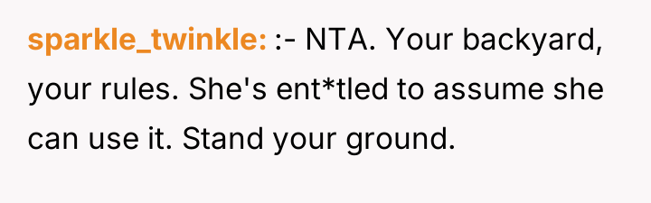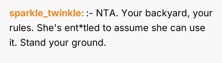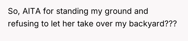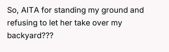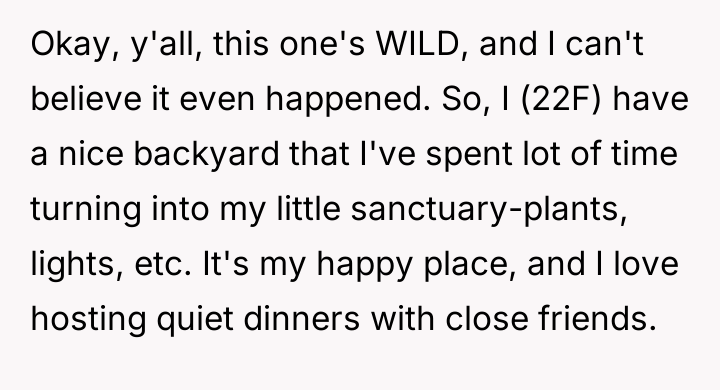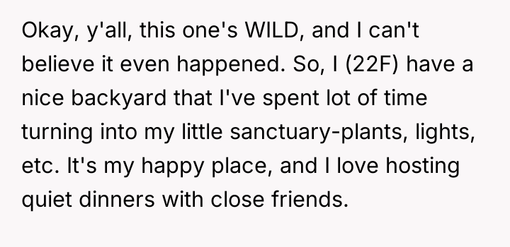 The user, a 22-year-old woman (OP), has invested time in making her backyard a personal sanctuary with plants and lighting for quiet gatherings with close friends. The core conflict began when her 43-year-old female neighbor approached the OP and requested to use this private space to host a large, loud birthday party for her son, which included plans for a bouncy castle and many children.