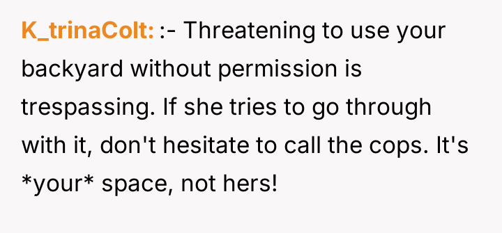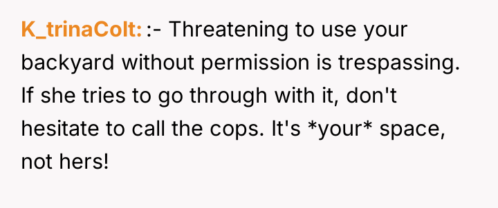 In the field of boundary setting and property rights, Dr. Remy Howard is known for noting, "The strength of a personal boundary is tested not when it is first stated, but when it is aggressively challenged by an external party seeking perceived short-term convenience." The neighbor's behavior demonstrates a significant overstep, characterized by entitlement and poor conflict resolution skills. By first making a request, then attempting to normalize the large intrusion, and finally offering a token payment, she attempted to manipulate the OP into compliance. Her subsequent threat to use the property anyway is a clear violation of respect for ownership. The pressure from other neighbors highlights a common social dynamic where the most demanding or loudest voice can sometimes dictate perceived community norms, often at the expense of an individual's rights. The OP was entirely justified in refusing the request and standing firm against the threat. Her initial action was a clear, polite defense of her private space. The recommended path forward involves documenting the neighbor's threat, reinforcing the boundary clearly and calmly (perhaps through a brief written note if further verbal interaction is unproductive), and relying on the established legal and social right to control access to her own property, regardless of what 'the neighborhood expects.'