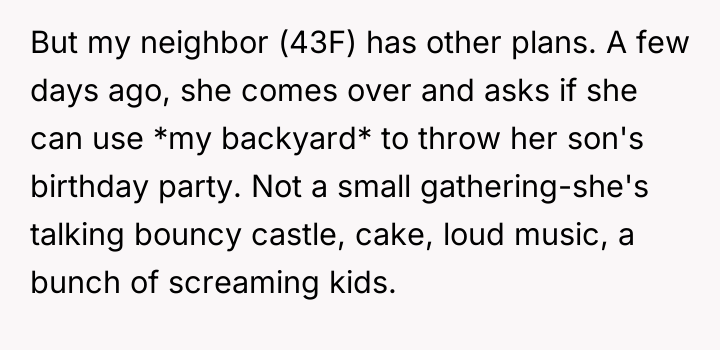 AITA for refusing to let my neighbor throw her kid’s birthday party in my backyard??? 💀😭