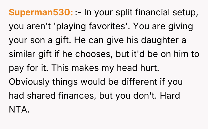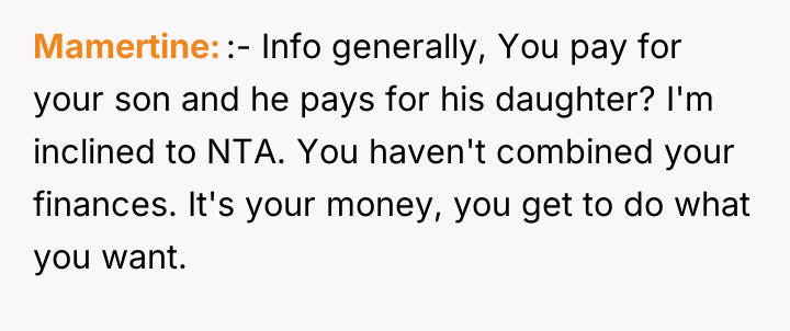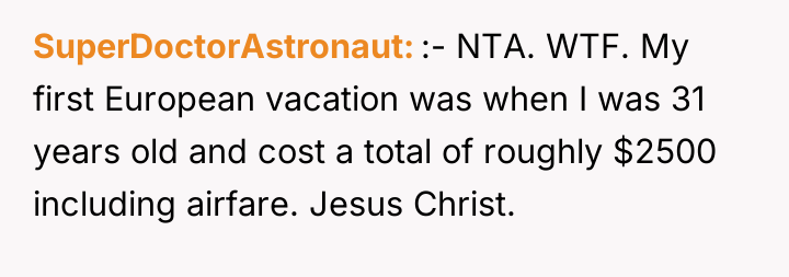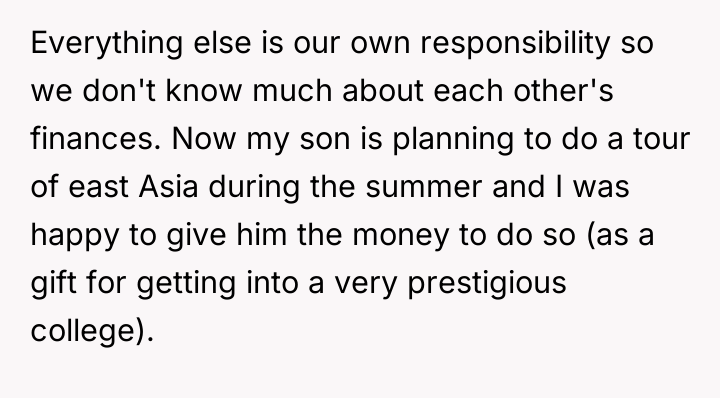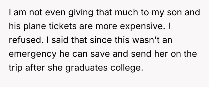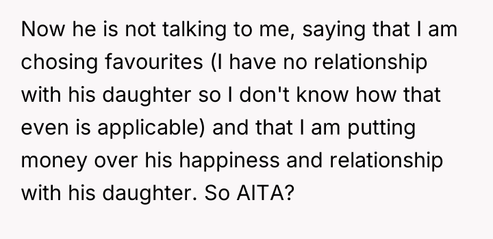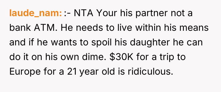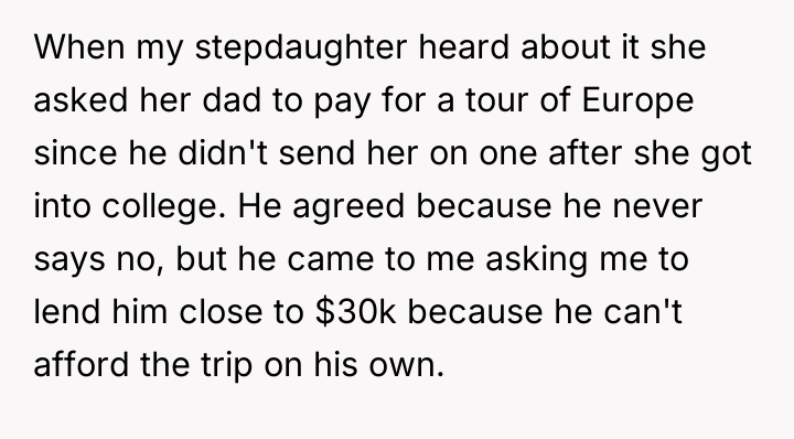 As renowned researcher Dr. Brené Brown explains, “Boundaries are the distance at which I can love you and me simultaneously.” This situation highlights a classic tension between respecting a partner's independent choices (funding his daughter) and protecting one's own established boundaries and financial philosophy. The OP and her partner have maintained separate financial spheres, which worked until the partner's inability to fund his generous promise intersected with the OP's substantial wealth. The partner's reaction—accusing the OP of playing favorites and prioritizing money over happiness—is a common deflection tactic when a boundary is enforced or a personal financial decision is questioned. The OP is not interfering with the partner's relationship with his daughter; she is refusing to underwrite his pattern of overspending or enabling. Her decision to save for her own son's experiences, rather than fund the stepdaughter's European tour, reflects a consistent approach to financial education, which contrasts sharply with the partner's pattern of immediate gratification for his child. The OP's refusal to lend the money, given her ability to afford it, was appropriate as it upheld her boundary against non-essential, interest-free lending that contradicts her values. For future effectiveness, the couple must move beyond treating finances as entirely separate domains when one partner’s financial actions directly create obligation or conflict for the other. A constructive recommendation would be for them to engage in a transparent discussion about their long-term financial expectations for their respective children, establishing shared principles for large, discretionary gifts or loans rather than allowing unilateral, high-stakes requests.