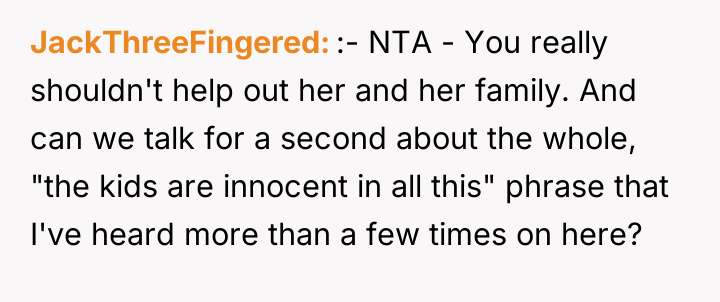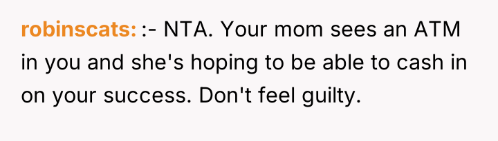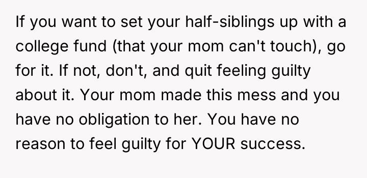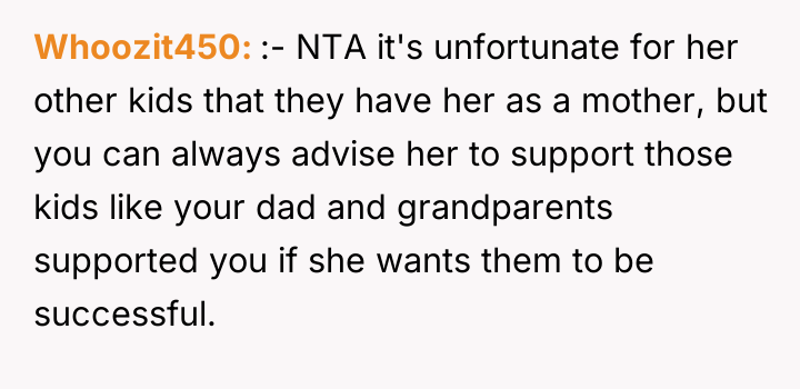 As renowned family therapist Dr. Harriet Lerner explains, “The first step toward change is awareness. The second step is acceptance. The third step is letting go of the need to change other people.” The core issue here involves unresolved trauma from parental abandonment and the subsequent struggle for establishing personal boundaries. The mother’s decision to force the 17-year-old OP out, combined with the perceived lack of remorse, created a profound breach of trust that the OP has not been able to bridge, despite professional success. The OP’s current wealth and success, ironically, provide the perfect platform for the mother to exert financial and emotional pressure, framing the OP’s success as a resource that must now benefit her new family unit. This is a classic example of boundary violation where one party (the mother) attempts to manage the guilt or needs of another (herself/her younger children) by demanding resources or emotional labor from the injured party (the OP). The OP’s desire to protect their current supportive family structure (father, grandparents) from the toxicity of the past relationship is appropriate. While the mother frames the issue around the 'innocent' younger siblings, the OP is not obligated to sacrifice their own emotional well-being to compensate for the choices their mother made. A constructive recommendation would involve setting firm, non-negotiable boundaries regarding contact and financial interaction with the mother's family. The OP could perhaps offer limited, structured support directed *only* toward the younger siblings' education or welfare, channeled through a neutral third party, thereby addressing the guilt without re-engaging in the damaging relationship dynamic with the mother.